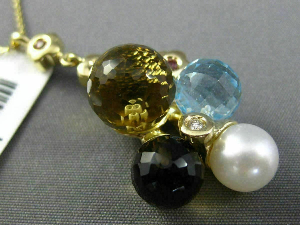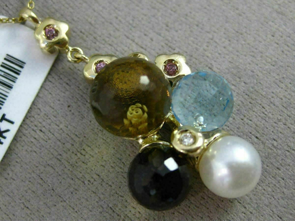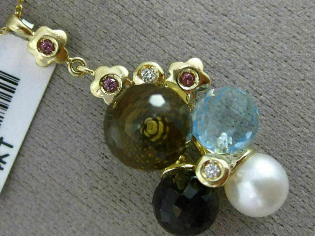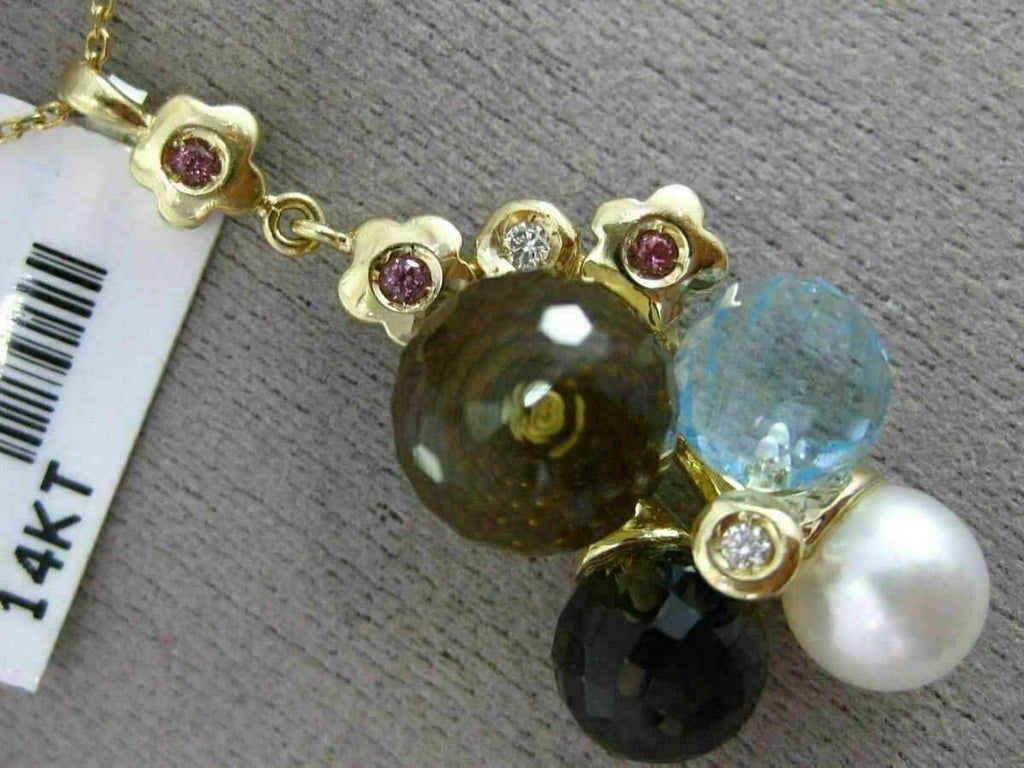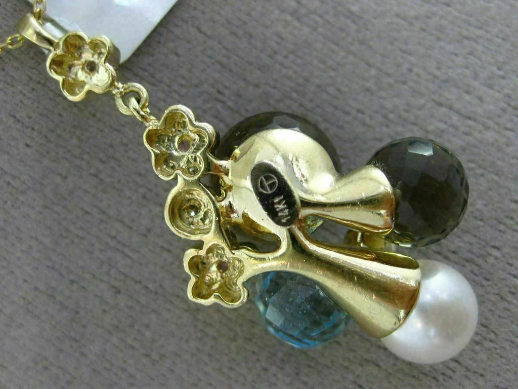 ESTATE LARGE 14KT YELLOW GOLD FLOATING PENDANT. 3D FLOWER DESIGN. DIAMONDS ARE F/G COLOR, VSSI CLARITY .05 CARATS. AAA PINK SAPPHIRE ARE APPROXIMATELY .10 CARATS. AAA BLUE TOPAZ IS APPROXIMATELY 1.50 CARATS. AAA SMOKEY TOPAZ IS APPROXIMATELY 2.0 CARATS. FEATURES AAA SOUTH SEA PEARL. MEASURES 41mm x 14mm WIDE. COMES ON A 14KT GOLD DIAMOND CUT 16" INCH CHAIN. WRITTEN APPRAISAL AVAILABLE. COMES IN A PRESENTABLE GIFT BOX.