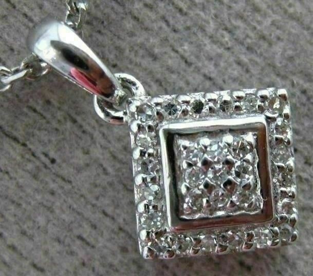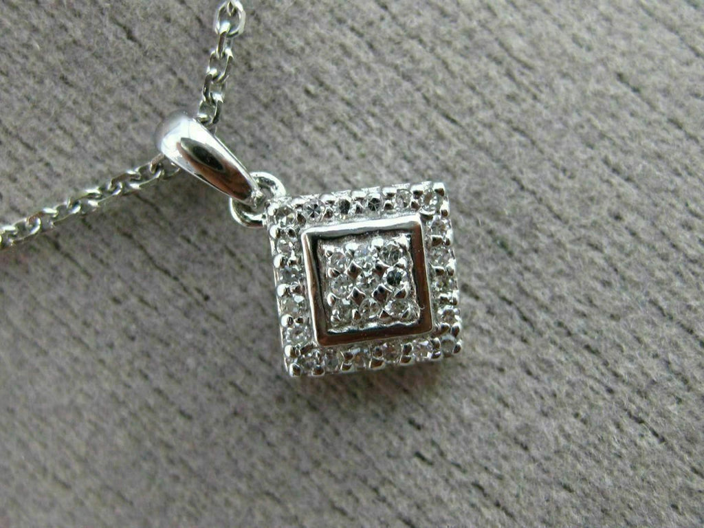 ESTATE SMALL 14KT WHITE GOLD FLOATING PENDANT. DOUBLE SQUARE CLASSIC CLUSTER DESIGN. DIAMONDS ARE F/G COLOR, VSSI CLARITY .09 CARATS. MEASURES 13mm X 8mm WIDE. COMES ON 14KT GOLD DIAMOND CUT 16" INCH CHAIN. WRITTEN APPRAISAL AVAILABLE. COMES IN A PRESENTABLE GIFT BOX.