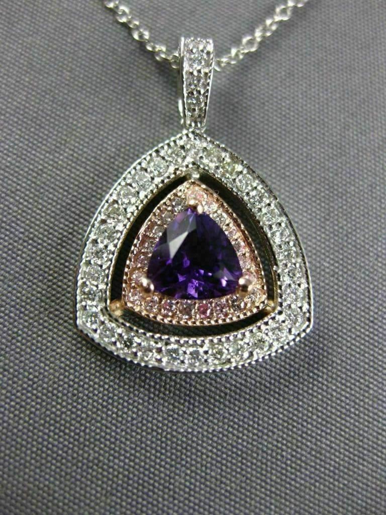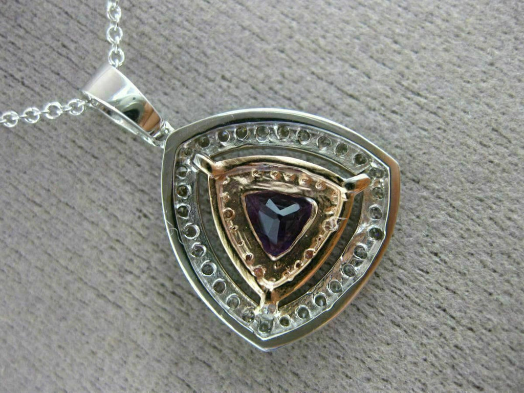 LARGE 14KT WHITE & ROSE GOLD FLOATING PENDANT. 3D TRILLION DOUBLE HALO DESIGN. DIAMONDS ARE F/G, VSSI CLARITY .42 CARATS. AAA AMETHYST IS .73 CARATS. MEASURES 23mm X 16mm WIDE. COMES ON A 14KT GOLD DIAMOND CUT 18" INCH CHAIN. WRITTEN APPRAISAL AVAILABLE. COMES IN A PRESENTABLE GIFT BOX.