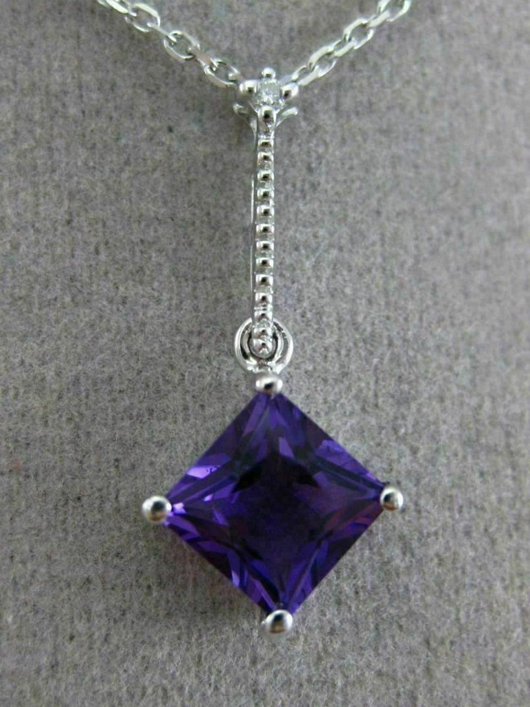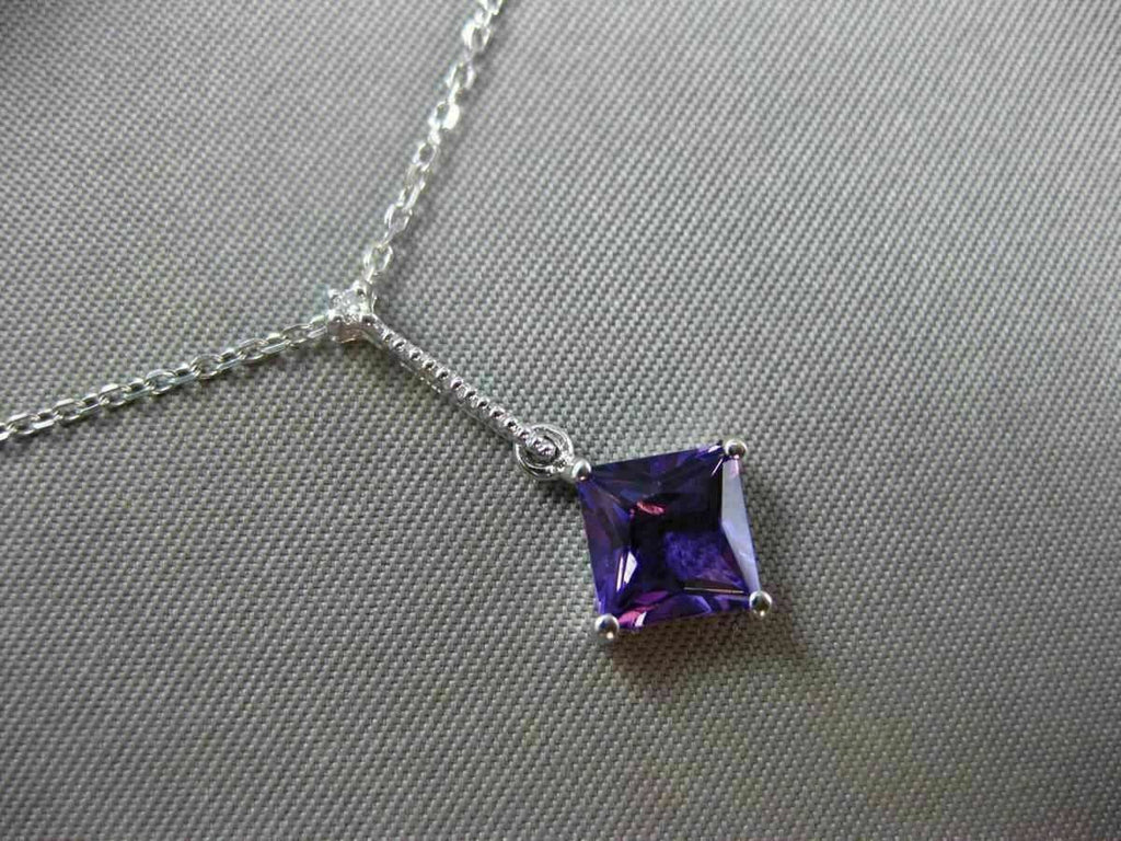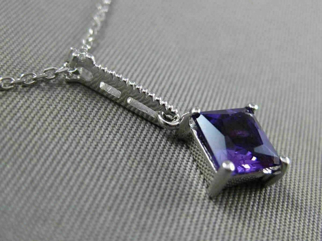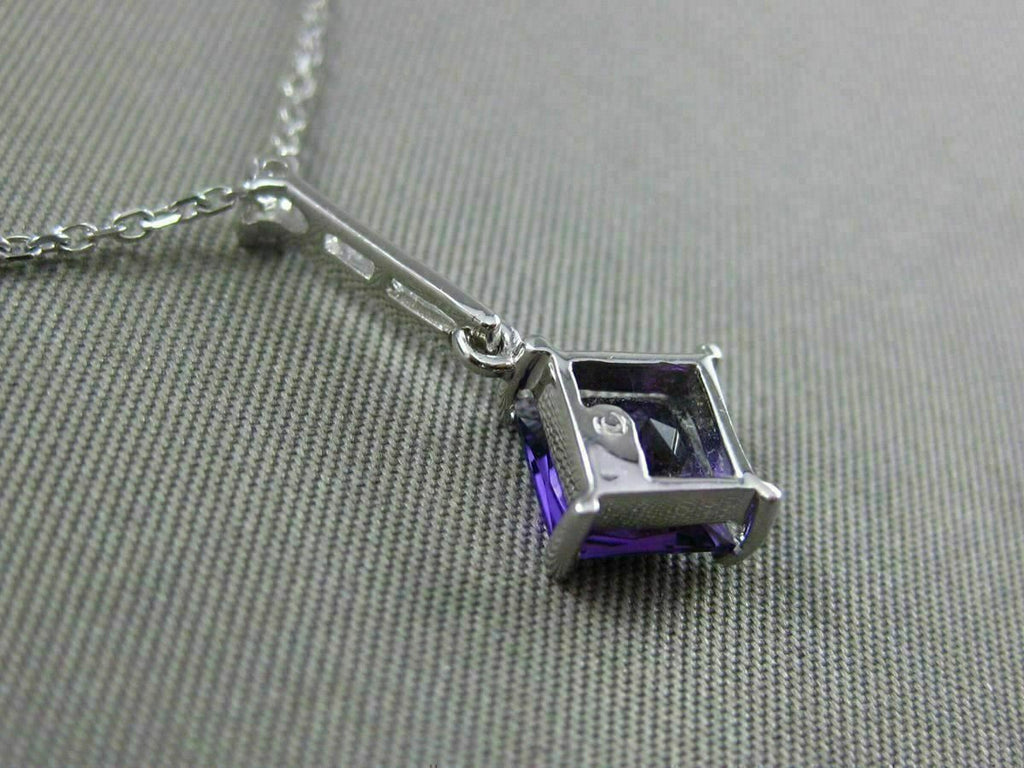 ESTATE 14KT WHITE GOLD FLOATING PENDANT. 3D ETOILE ELONGATED SQUARE DESIGN. DIAMONDS ARE F/G COLOR, VVSI CLARITY .01 CARATS. EXTRA FACET AMETHYST IS 1.05 CARATS. MEASURES 21mm x 9.5mm WIDE. COMES ON A 14KT GOLD DIAMOND CUT 16" INCH CHAIN. WRITTEN APPRAISAL AVAILABLE. COMES IN A PRESENTABLE GIFT BOX.