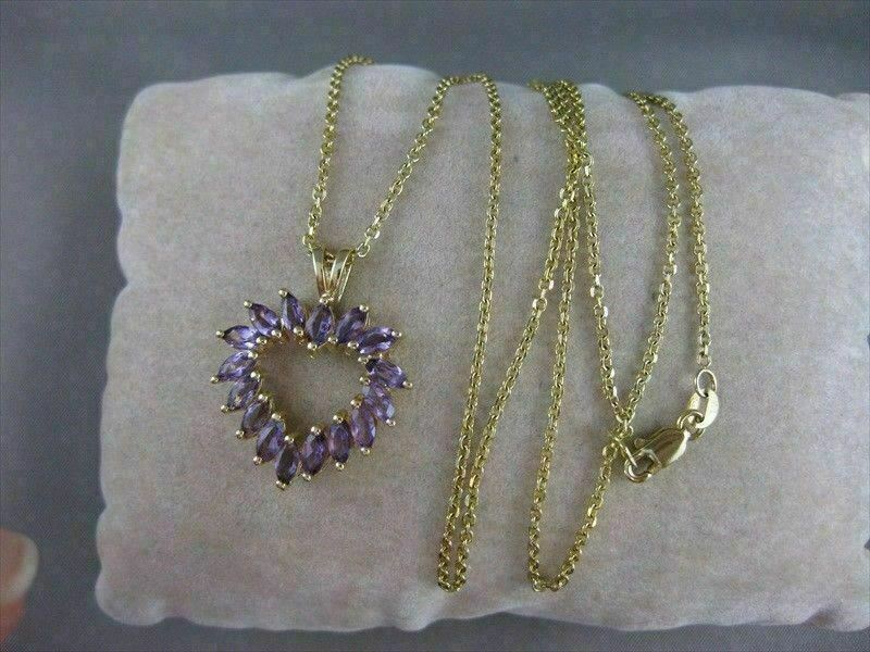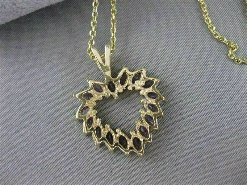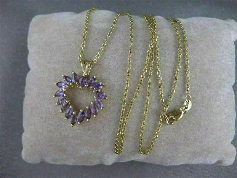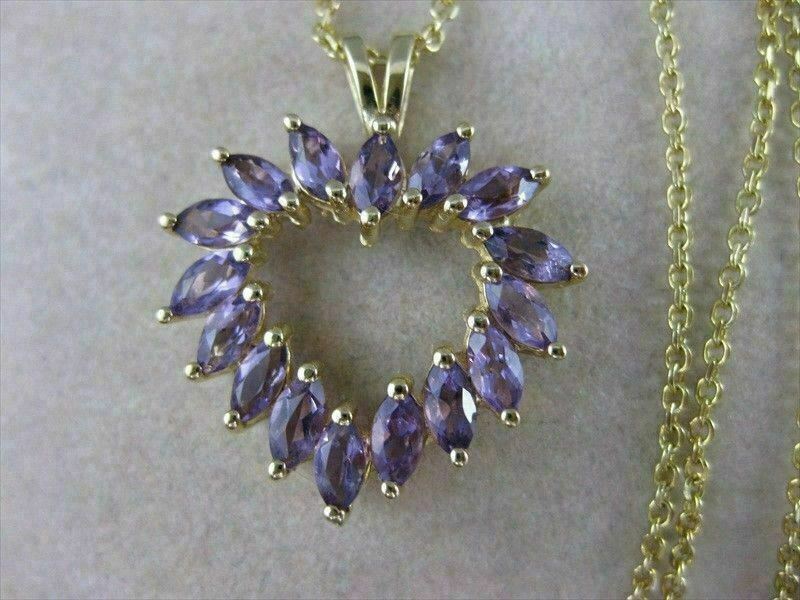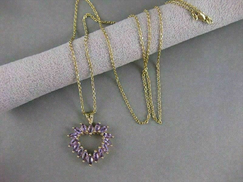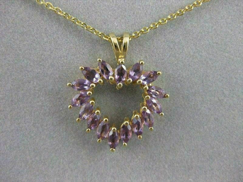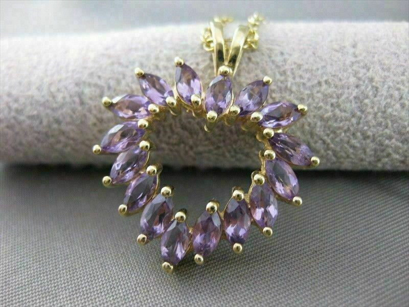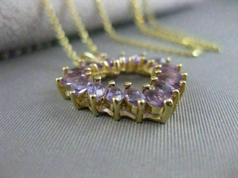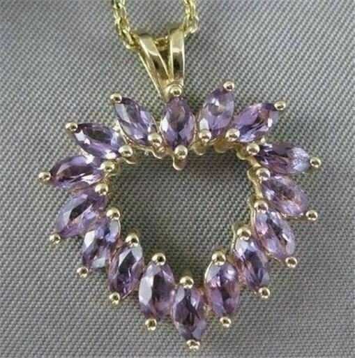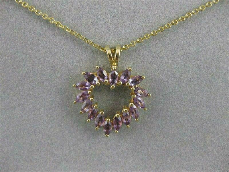 ESTATE 14KT YELLOW GOLD PENDANT. OPEN HANGING HEART DESIGN. 16 LIGHT AMETHYSTS ARE 1.92CTW CARATS. MEASURES 27MM x 22MM. COMES ON A 14K DIAMOND CUT CHAIN. WRITTEN APPRAISAL AVAILABLE. COMES IN A GIFT BOX.