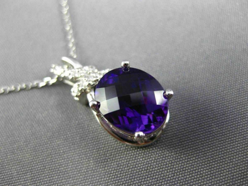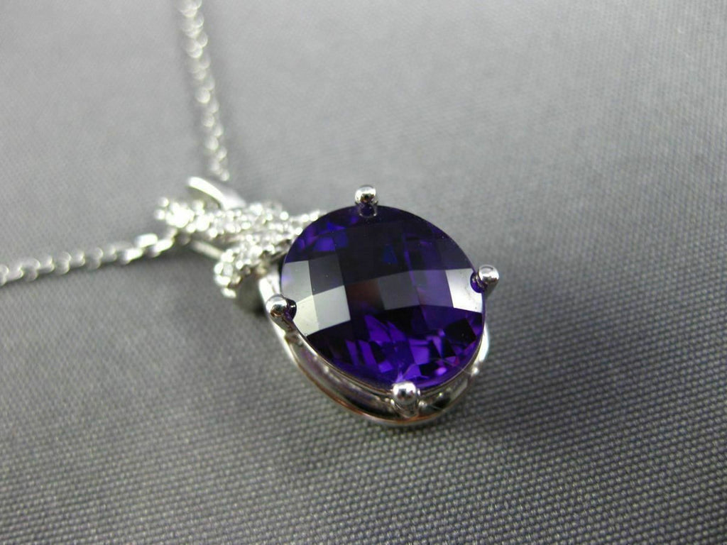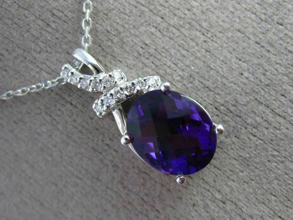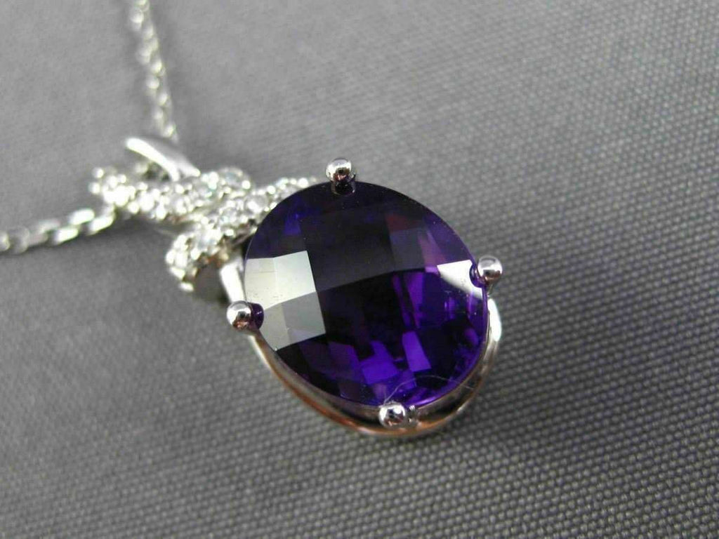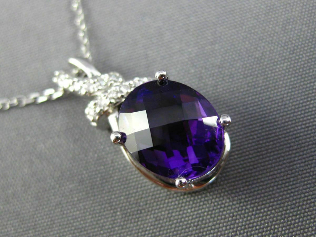ESTATE 14KT WHITE GOLD FLOATING PENDANT. 3D OVAL BOW DESIGN. DIAMONDS ARE F/G COLOR, VSSI CLARITY .09 CARATS. AAA EXTRA FACET AMETHYST IS 2.30 CARATS. MEASURES 20mm x 8mm WIDE. COMES ON A 14KT GOLD DIAMOND CUT 16" INCH CHAIN. WRITTEN APPRAISAL AVAILABLE. COMES IN A PRESENTABLE GIFT BOX.