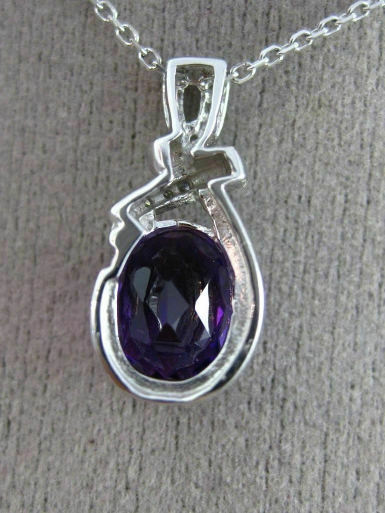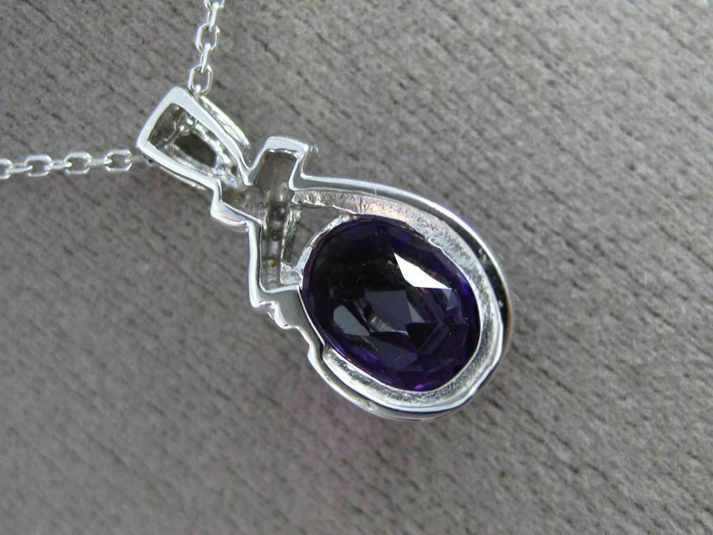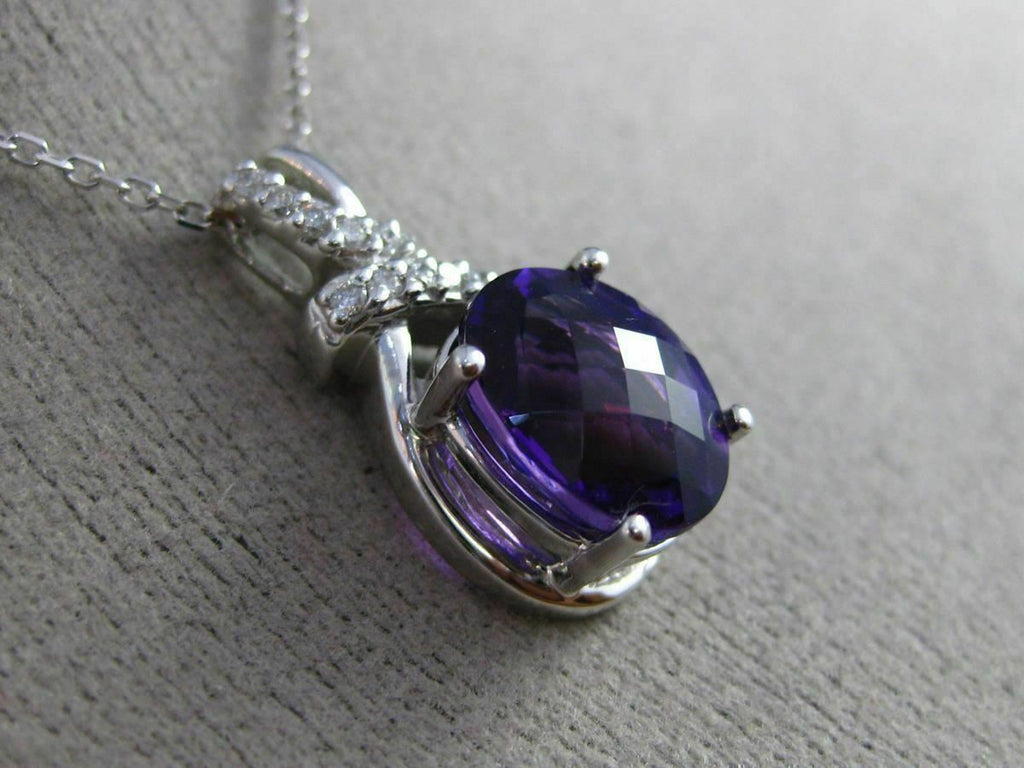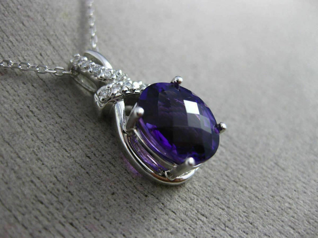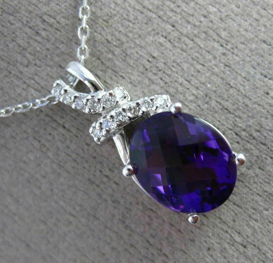 ESTATE 14KT WHITE GOLD FLOATING PENDANT. 3D OVAL BOW DESIGN. DIAMONDS ARE F/G COLOR, VSSI CLARITY .09 CARATS. AAA EXTRA FACET AMETHYST IS 2.30 CARATS. MEASURES 20mm x 8mm WIDE. COMES ON A 14KT GOLD DIAMOND CUT 16" INCH CHAIN. WRITTEN APPRAISAL AVAILABLE. COMES IN A PRESENTABLE GIFT BOX.