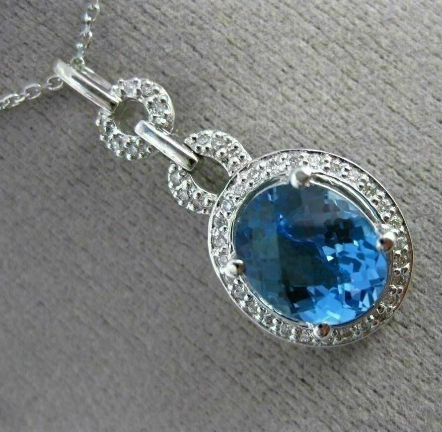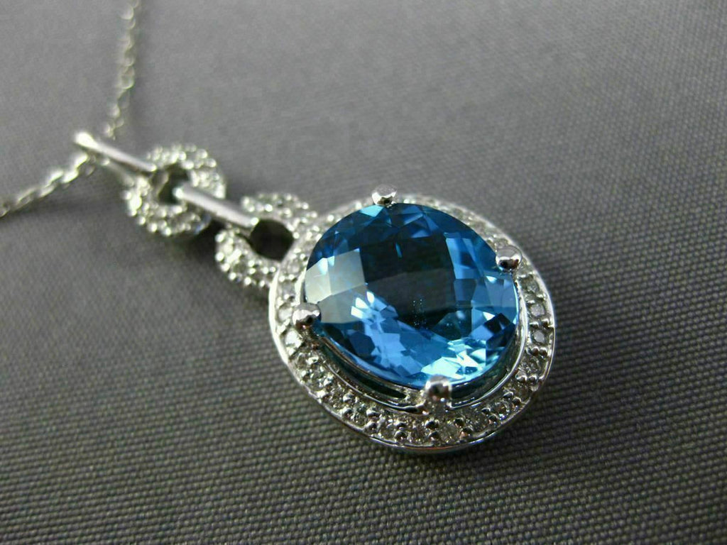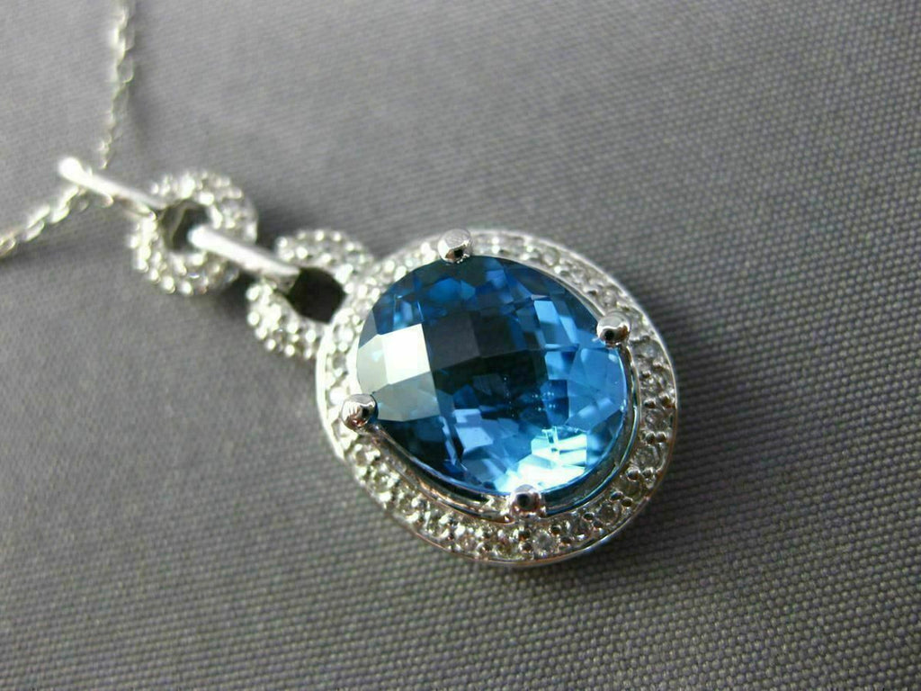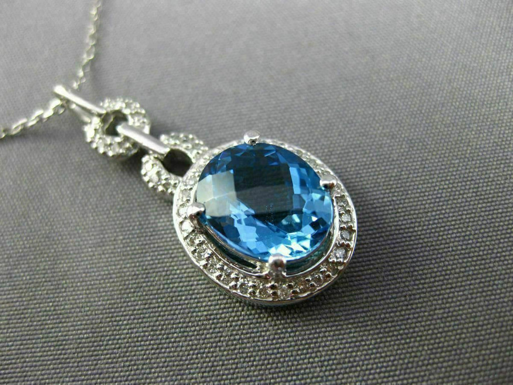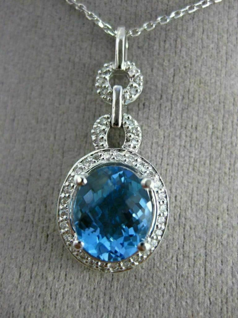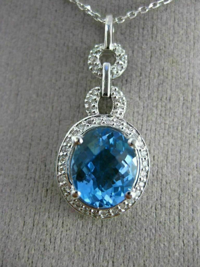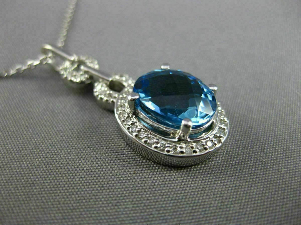 ESTATE 14KT WHITE GOLD FLOATING PENDANT. 3D OVAL HALO DESIGN. DIAMONDS ARE F/G COLOR, VSSI CLARITY .20 CARATS. AAA EXTRA FACET BLUE TOPAZ IS 2.90 CARATS. MEASURES 30mm x 13mm WIDE. COMES ON A 14KT GOLD DIAMOND CUT 16" INCH CHAIN. WRITTEN APPRAISAL AVAILABLE. COMES IN A PRESENTABLE GIFT BOX.