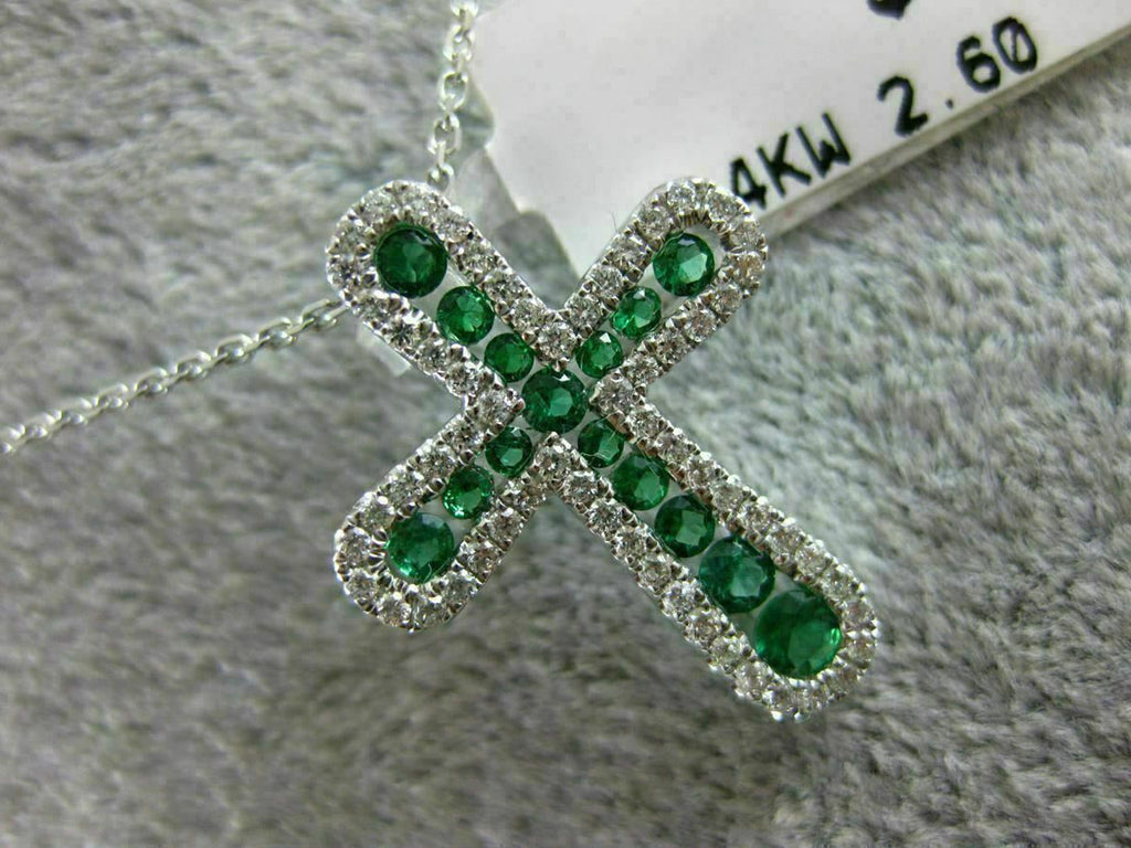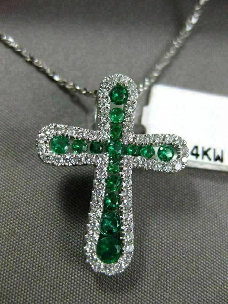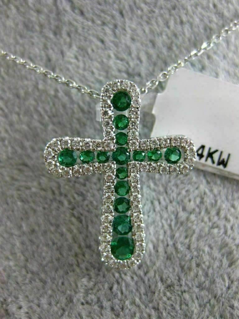 ESTATE 14KT WHITE GOLD FLOATING PENDANT. 3D CROSS DESIGN. DIAMONDS ARE F/G COLOR, VSSI CLARITY .32 CARATS. AAA EMERALD ARE .12 CARATS. MEASURES 22mm X 16mm. COMES ON A 14KT GOLD DIAMOND CUT 16" INCH CHAIN. WRITTEN APPRAISAL AVAILABLE. COMES IN A PRESENTABLE GIFT BOX.