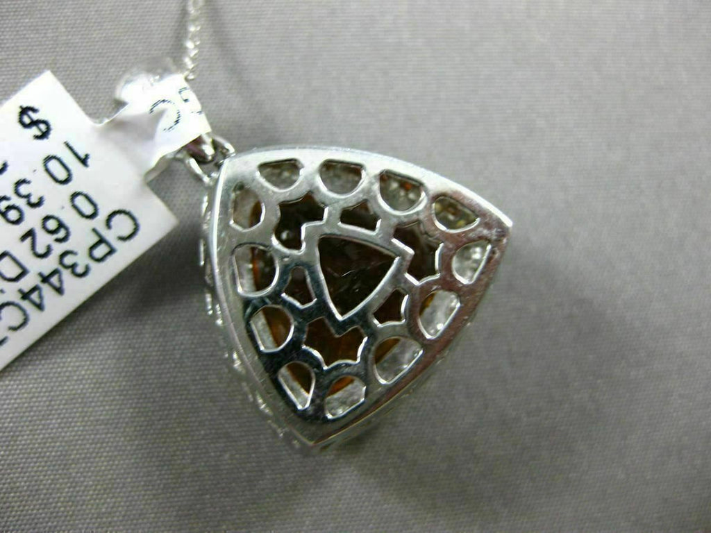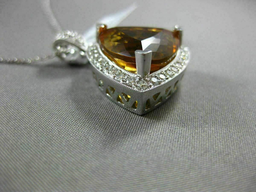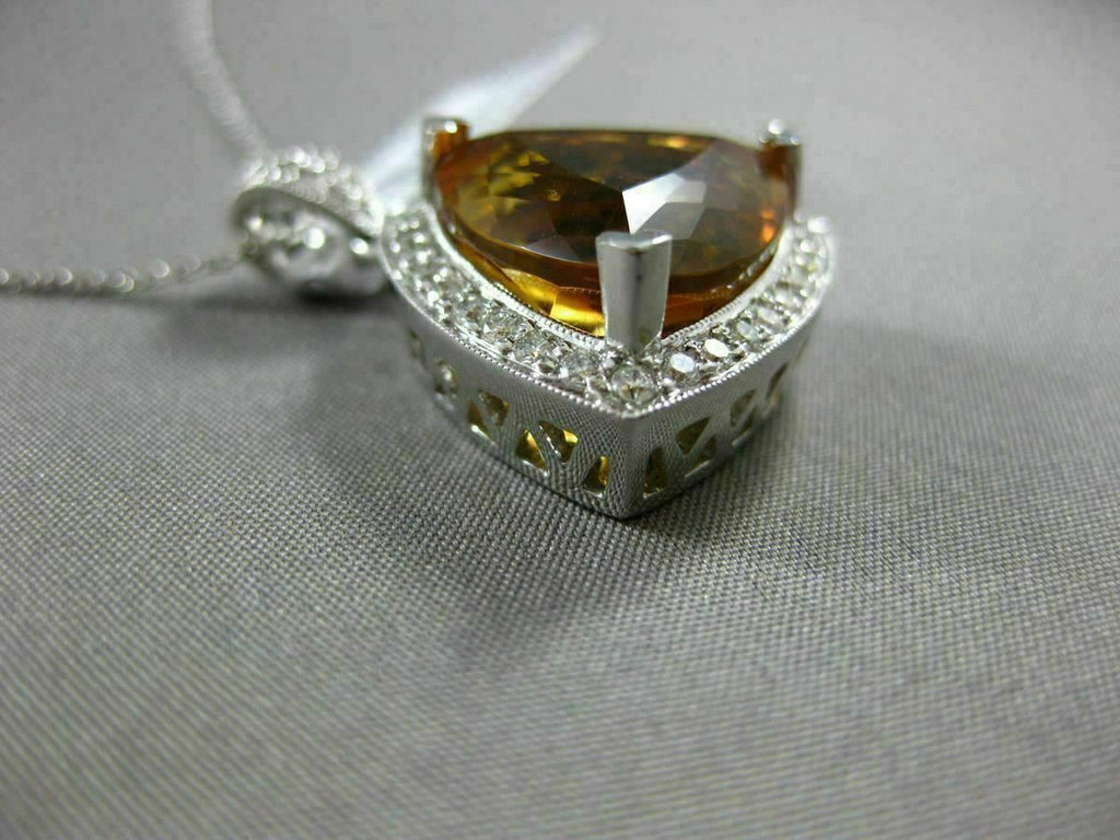 ESTATE EXTRA LARGE 14KT WHITE GOLD PENDANT. 3D FLOATING FILIGREE HALO DESIGN. DIAMONDS ARE F/G COLOR, VVS/VS CLARITY .62 CARATS. AAA EXTRA FACET TRILLION CUT CITRINE IS 10.39 CARATS. MEASURES 29mm X 20mm WIDE. COMES ON A 14KT GOLD DIAMOND CUT 16" INCH CHAIN. WRITTEN APPRAISAL AVAILABLE. COMES IN A PRESENTABLE GIFT BOX.
