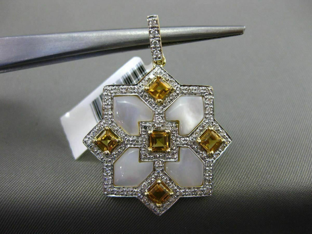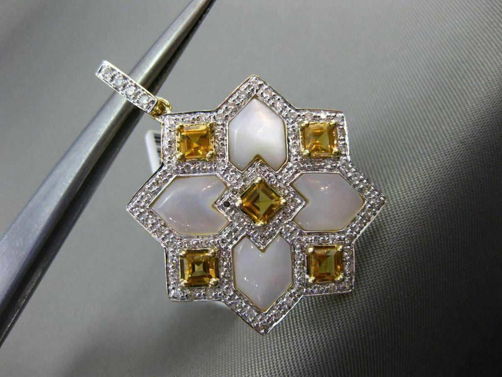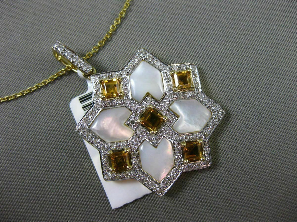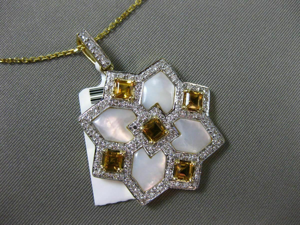 ESTATE LARGE 14KT WHITE & YELLOW GOLD FLOATING PENDANT. 3D SQUARE SNOWFLAKE STAR DESIGN. DIAMOND ARE F/G COLOR, VSSI CLARITY .40 CARATS. AAA CITRINE ARE 1.10 CARATS. CONSISTS OF MOTHER OF PEARL. MEASURES 36mm X 26mm WIDE. COMES ON A 14KT GOLD DIAMOND CUT 16" INCH CHAIN. WRITTEN APPRAISAL AVAILABLE. COMES IN A PRESENTABLE GIFT BOX