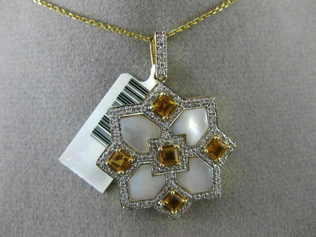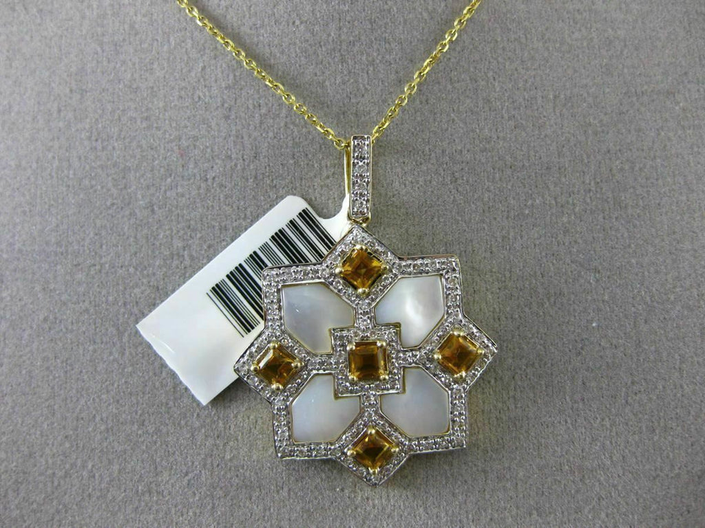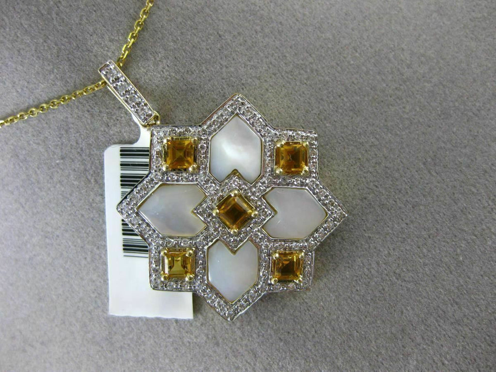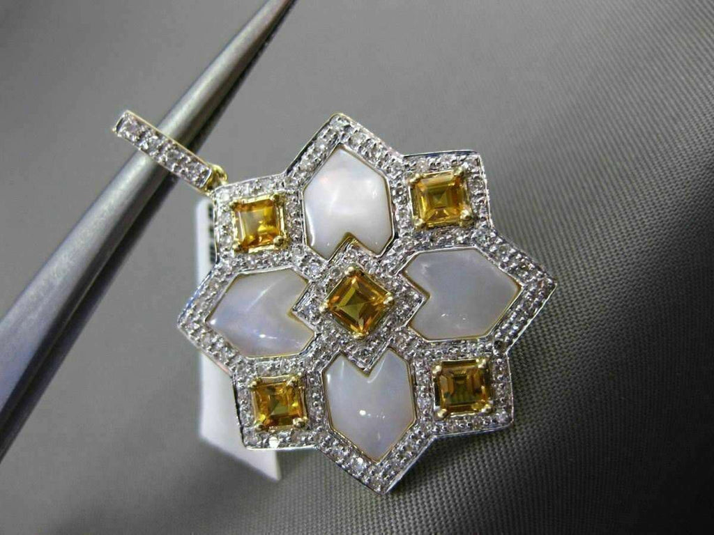 ESTATE LARGE 14KT WHITE & YELLOW GOLD FLOATING PENDANT. 3D SQUARE SNOWFLAKE STAR DESIGN. DIAMOND ARE F/G COLOR, VSSI CLARITY .40 CARATS. AAA CITRINE ARE 1.10 CARATS. CONSISTS OF MOTHER OF PEARL. MEASURES 36mm X 26mm WIDE. COMES ON A 14KT GOLD DIAMOND CUT 16" INCH CHAIN. WRITTEN APPRAISAL AVAILABLE. COMES IN A PRESENTABLE GIFT BOX