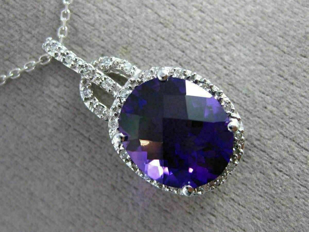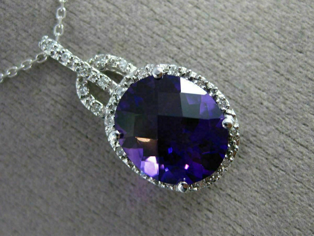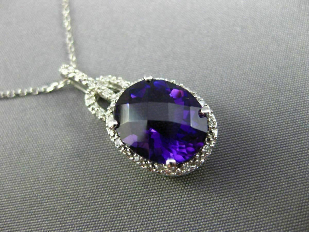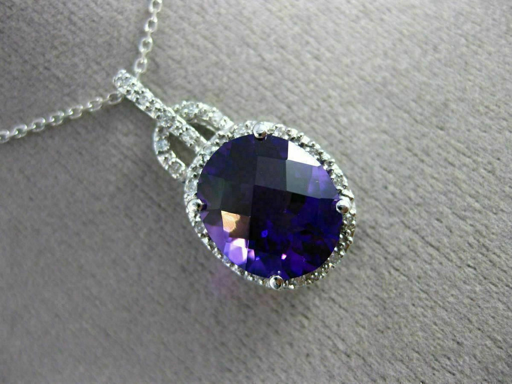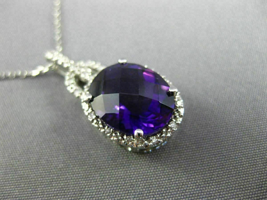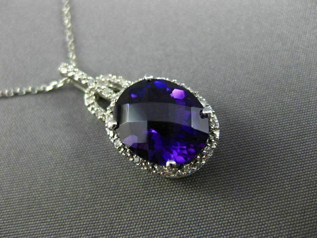ESTATE LARGE 14KT WHITE GOLD FLOATING PENDANT. 3D OVAL HALO DESIGN. DIAMONDS ARE F/G COLOR, VSSI CLARITY .06 CARATS. AAA EXTRA FACET AMETHYST IS 4.35 CARATS. MEASURES 24mm x 12mm WIDE. COMES ON A 14KT GOLD DIAMOND CUT 16" INCH CHAIN. WRITTEN APPRAISAL AVAILABLE. COMES IN A PRESENTABLE GIFT BOX.