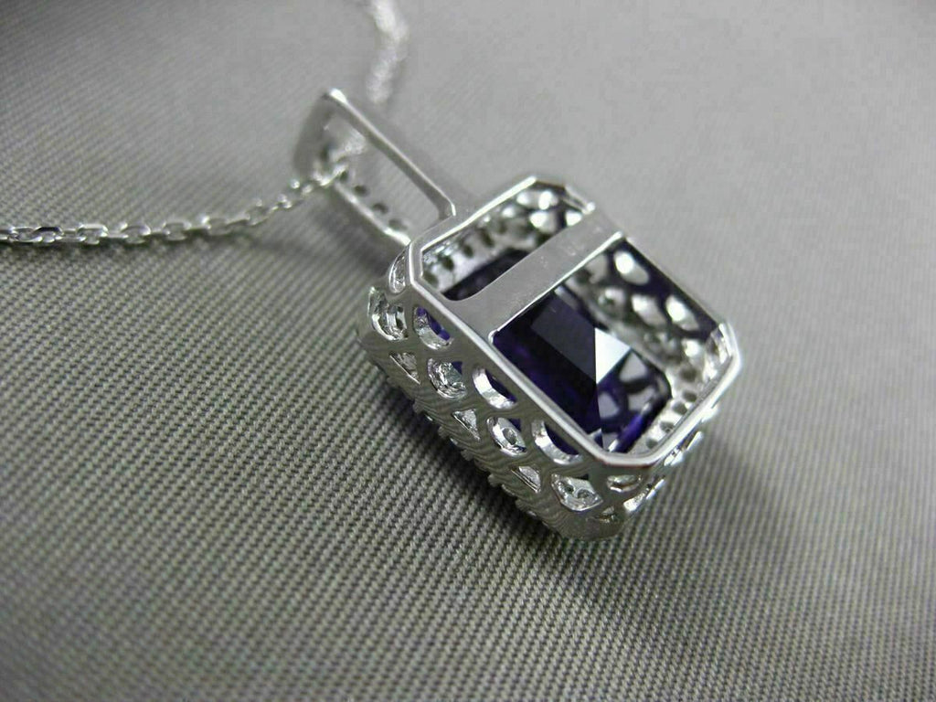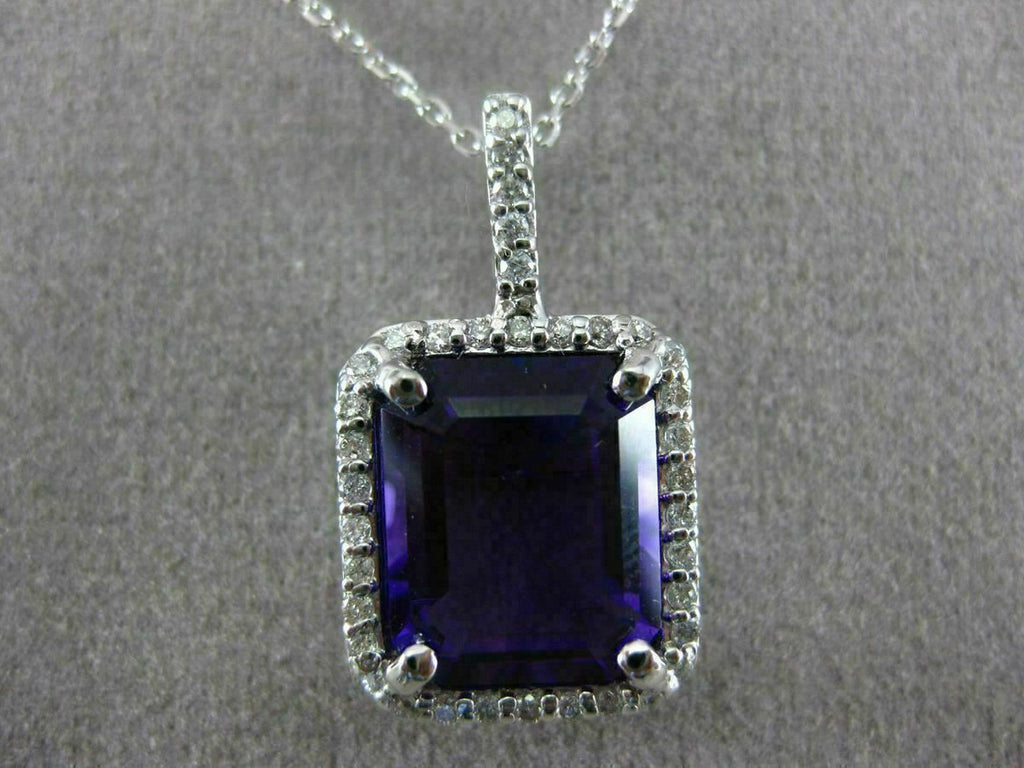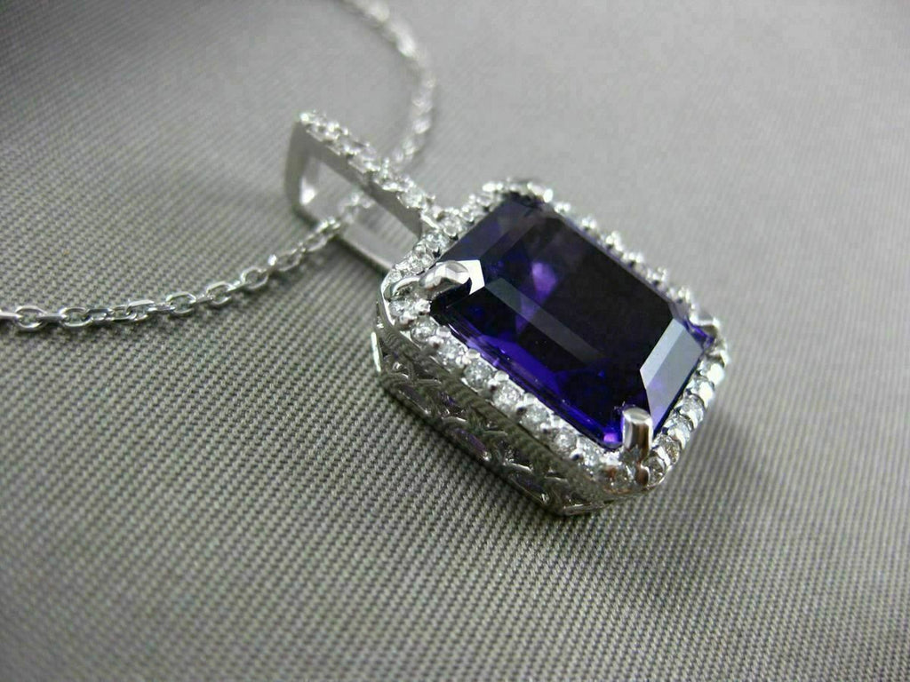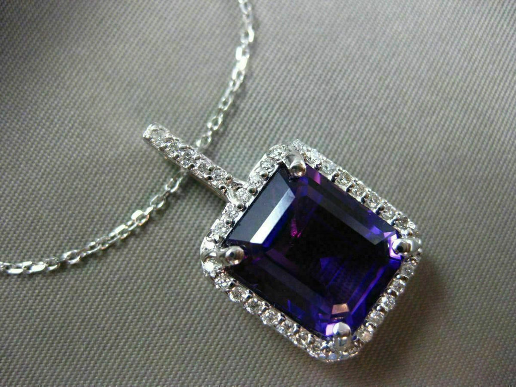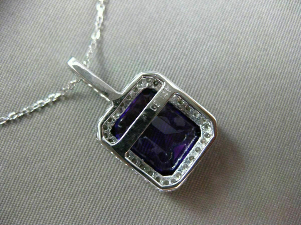 ESTATE LARGE 14KT WHITE GOLD FLOATING PENDANT. 3D FILIGREE HALO CLASSIC DESIGN. DIAMONDS ARE F/G COLOR, VVSI CLARITY .29 CARATS. AAA EXTRA FACET EMERALD CUT AMETHYST IS 6.75 CARATS. MEASURES 23.5mm x 13mm WIDE. COMES ON A 14KT GOLD DIAMOND CUT 16" INCH CHAIN. WRITTEN APPRAISAL AVAILABLE. COMES IN A PRESENTABLE GIFT BOX.