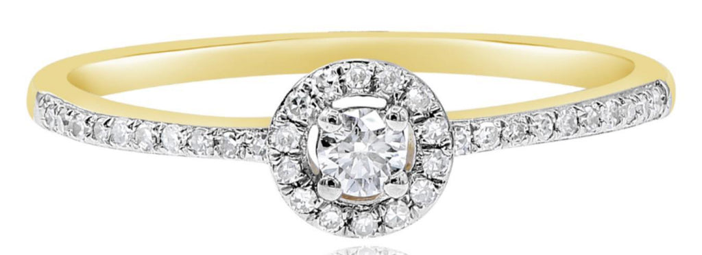 14KT YELLOW GOLD FRIENDSHIP LOVE RING. 3D SOLITAIRE HALO CLASSIC DESIGN. ROUND DIAMONDS ARE F/G COLOR, VSSI CLARITY .20 CARATS. RING SIZE 7. CAN BE SIZED BY OUR MASTER JEWELER UPON REQUEST. WRITTEN APPRAISAL AVAILABLE. COMES IN A PRESENTABLE GIFT BOX.