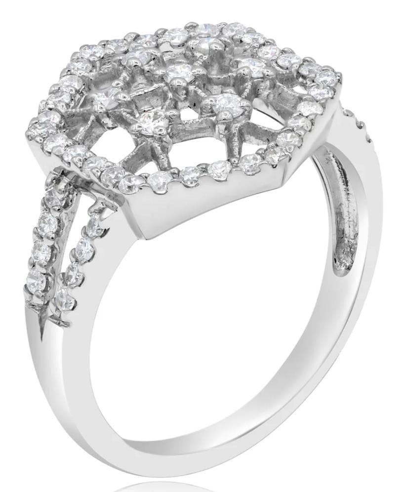 14KT WHITE GOLD FUN RING. 3D OPEN FILIGREE FLOWER SNOWFLAKE OCTAGON DESIGN. ROUND DIAMONDS ARE F/G COLOR, VSSI CLARITY .55 CARATS. RING SIZE 7. CAN BE SIZED BY OUR MASTER JEWELER UPON REQUEST. WRITTEN APPRAISAL AVAILABLE. COMES IN A PRESENTABLE GIFT BOX.