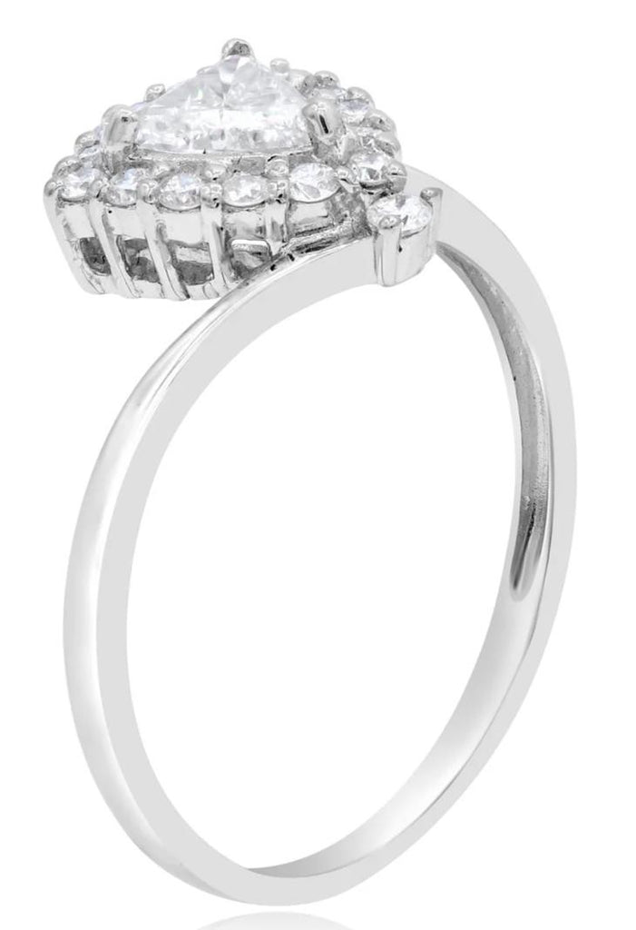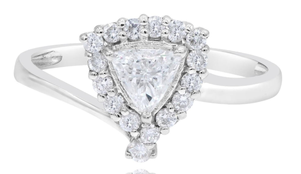 18KT WHITE GOLD FRIENDSHIP LOVE RING. 3D CRISS CROSS HALO DESIGN. ROUND AND TRILLION CUT DIAMONDS ARE F/G COLOR, VSSI CLARITY .56 CARATS. ROUND DIAMONDS ARE .25 CARATS. TRILLION CUT DIAMONDS ARE .31 CARATS. RING SIZE 7. CAN BE SIZED BY OUR MASTER JEWELER UPON REQUEST. WRITTEN APPRAISAL AVAILABLE. COMES IN A PRESENTABLE GIFT BOX.