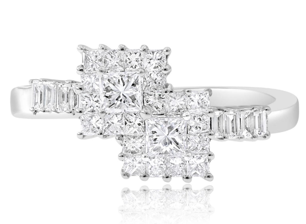 .94CT DIAMOND 18KT WHITE GOLD PRINCESS & BAGUETTE DOUBLE SQUARE CRISS CROSS RING
