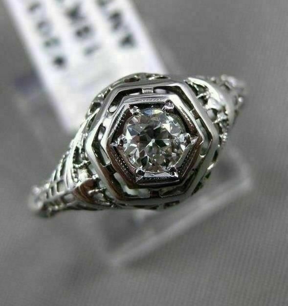 ANTIQUE 18KT WHITE GOLD ENGAGEMENT RING. 3D FILIGREE DESIGN. OLD MINE ROUND DIAMOND IS H COLOR, SI CLARITY .40 CARATS. MEASURES 10mm WIDE. RING SIZE 5.25. CAN BE SIZED BY OUR MASTER JEWELER. WRITTEN APPRAISAL AVAILABLE. COMES IN A PRESENTABLE GIFT BOX