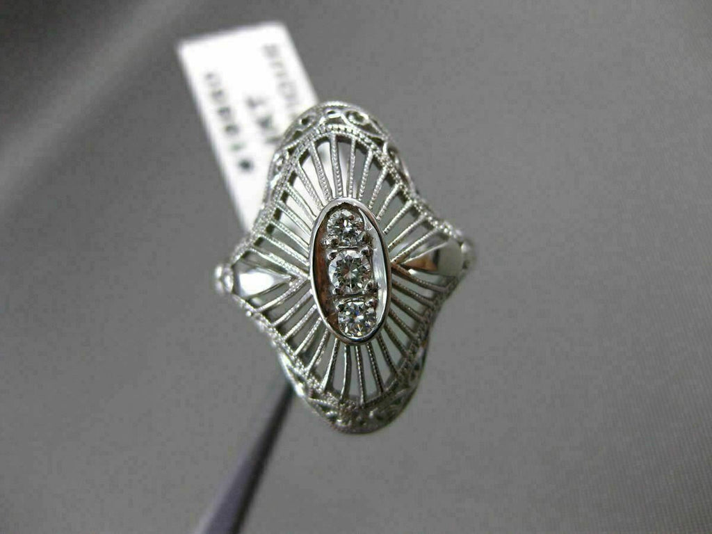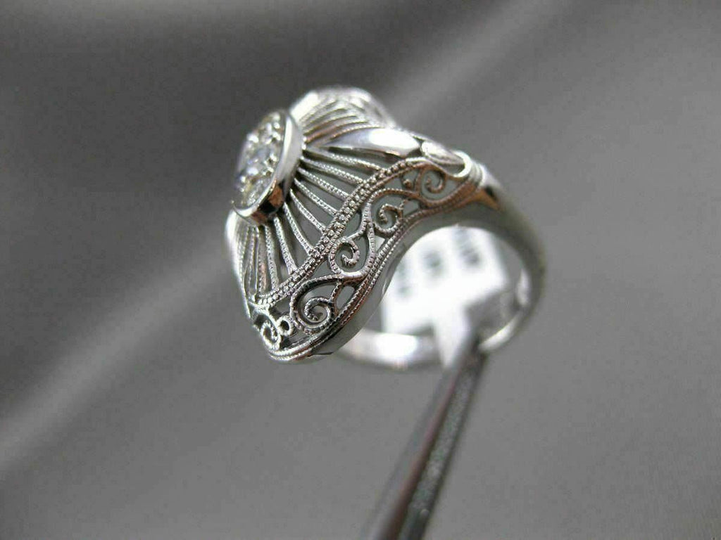 ANTIQUE LARGE 14KT WHITE GOLD RING. FILIGREE, NORTH SOUTH DESIGN. OLD MINE DIAMONDS ARE G/H COLOR, VS CLARITY .14 CARATS. MEASURES 23mm WIDE. RING SIZE 6. CAN BE SIZED BY OUR MASTER JEWELER. WRITTEN APPRAISAL AVAILABLE. COMES IN A PRESENTABLE GIFT BOX