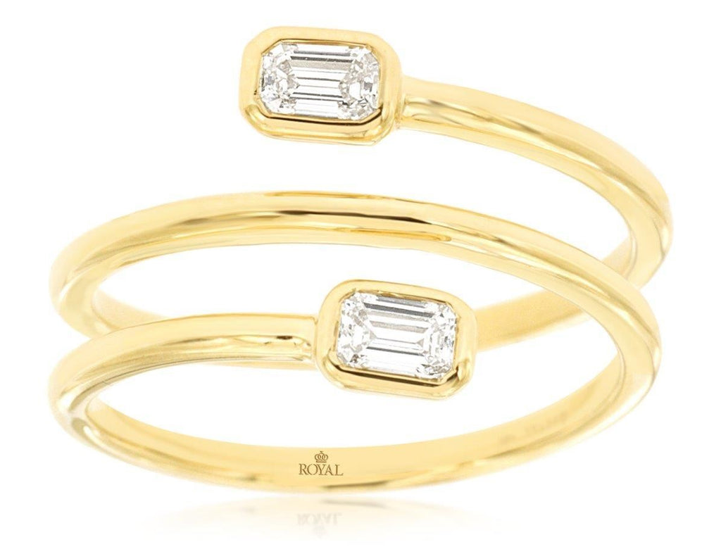 ESTATE 14KT YELLOW GOLD LOVE RING. 3D TWO STONE CRISS CROSS DESIGN. EMERALD CUT DIAMONDS ARE F/G COLOR, VSSI CLARITY .30 CARATS. RING SIZE 7. CAN BE SIZED BY OUR MASTER JEWELER UPON REQUEST. WRITTEN APPRAISAL AVAILABLE. COMES IN A PRESENTABLE GIFT BOX.