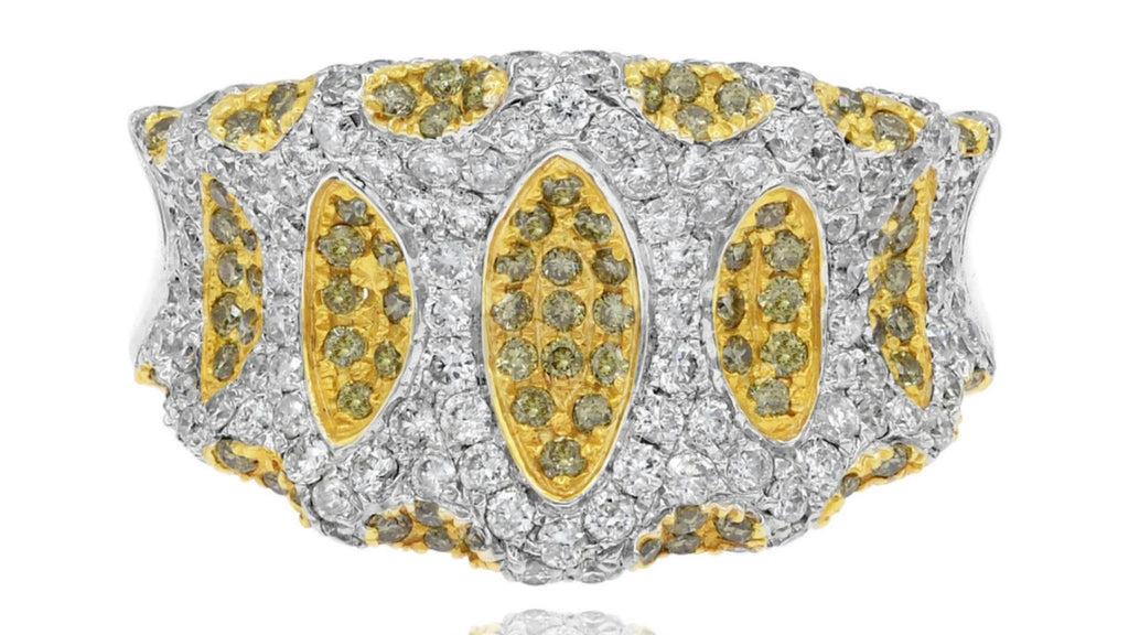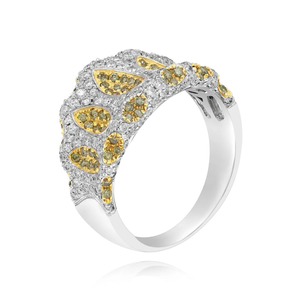 LARGE 14KT WHITE GOLD FUN RING. 3D MARQUISE SHAPE OVAL DESIGN. WHITE DIAMONDS ARE F/G COLOR, VSSI CLARITY 1.0 CARAT. FANCY YELLOW DIAMONDS ARE .48 CARATS. RING SIZE 7. CAN BE SIZED BY OUR MASTER JEWELER UPON REQUEST. WRITTEN APPRAISAL AVAILABLE. COMES IN A PRESENTABLE GIFT BOX.