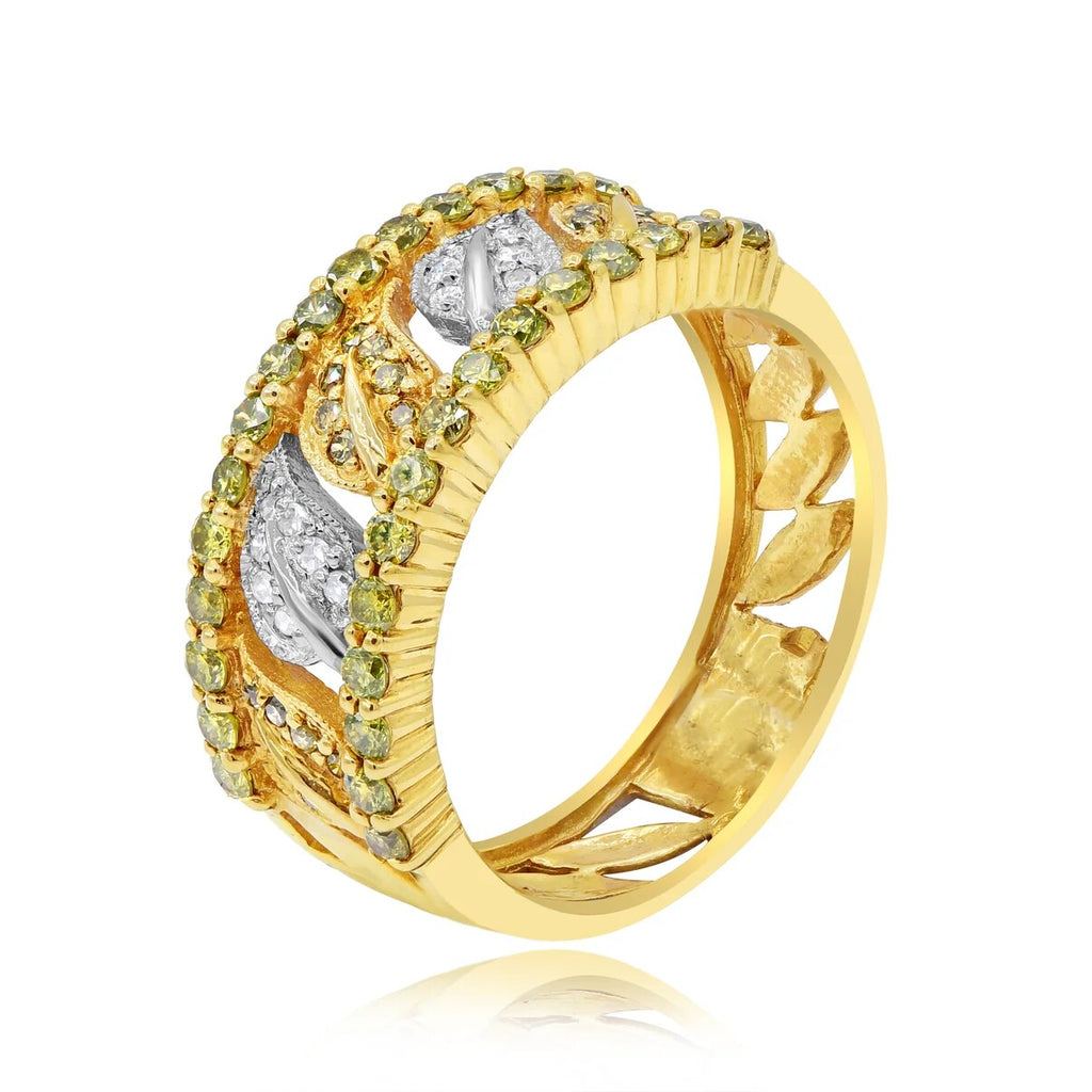 WIDE 14KT WHITE AND YELLOW GOLD FUN RING. 3D MULTI LEAF OPEN FILIGREE DESIGN. ROUND WHITE DIAMONDS ARE F/G COLOR, VSSI CLARITY .08 CARATS. ROUND FANCY YELLOW DIAMONDS ARE .72 CARATS. RING SIZE 7. CAN BE SIZED BY OUR MASTER JEWELER UPON REQUEST. WRITTEN APPRAISAL AVAILABLE. COMES IN A PRESENTABLE GIFT BOX.