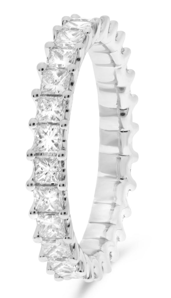 ESTATE 14KT WHITE GOLD ANNIVERSARY RING. 3D CLASSIC ETERNITY  DESIGN. PRINCESS CUT  DIAMONDS ARE F/G COLOR, VSSI CLARITY 1.79 CARATS. MEASURES 3.33mm WIDE. RING SIZE 6.5. CAN BE SIZED BY OUR MASTER JEWELER UPON REQUEST. WRITTEN APPRAISAL AVAILABLE. COMES IN A PRESENTABLE GIFT BOX.