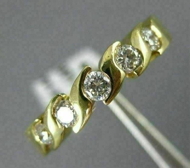 ESTATE 14KT YELLOW GOLD ANNIVERSARY RING. 3D 5 STONE "S" SHAPE DESIGN. DIAMONDS ARE F/G COLOR, VS CLARITY .35 CARATS. MEASURES 3.5MM WIDE. RING SIZE 6. CAN BE SIZED BY OUR MASTER JEWELER UPON REQUEST. WRITTEN APPRAISAL AVAILABLE. COMES IN A PRESENTABLE GIFT BOX.