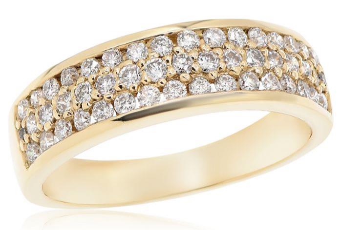 ESTATE 14KT YELLOWGOLD ANNIVERSARYRING. 3D CLASSIC CHANNEL ROUNDDESIGN. DIAMONDS ARE F/G COLOR, VSSI CLARITY .71CARATS.RING SIZE 7. CAN BE SIZED BY OUR MASTER JEWELER UPON REQUEST. WRITTEN APPRAISAL AVAILABLE. COMES IN A PRESENTABLE GIFT BOX.