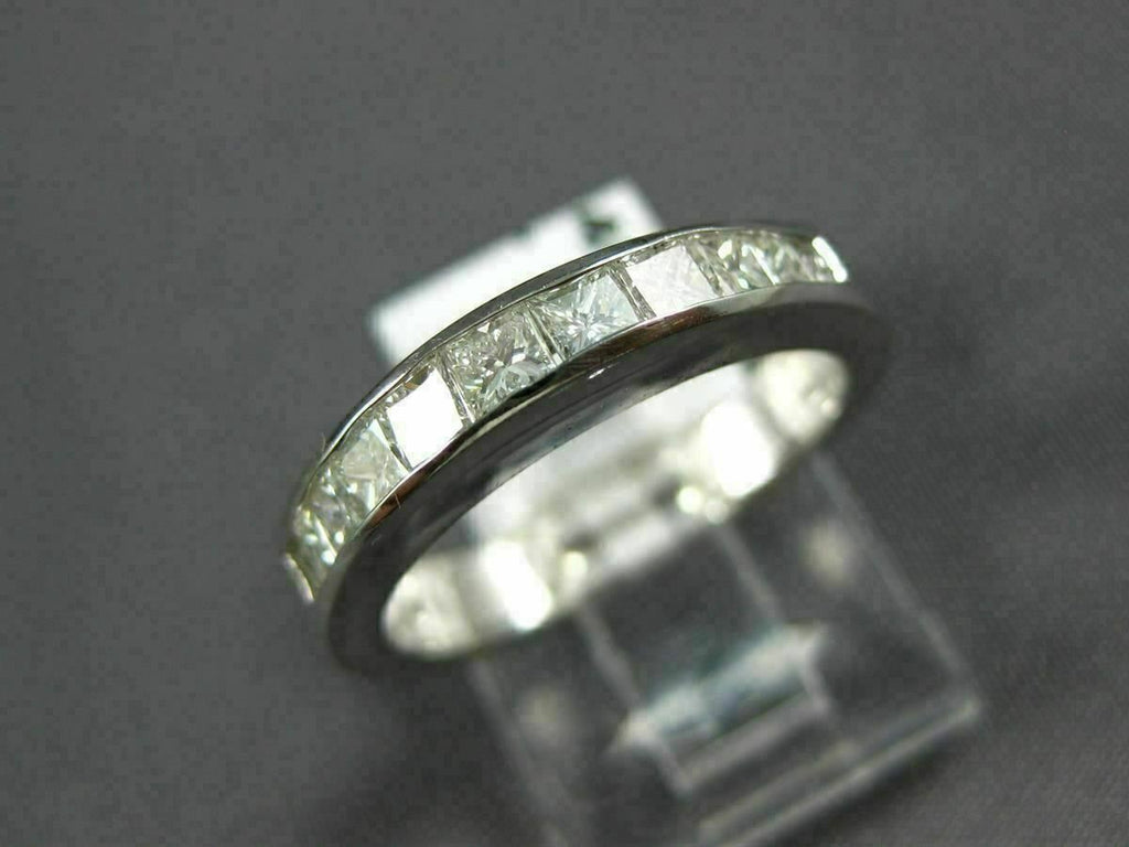ESTATE 14KT WHITE GOLD ANNIVERSARY RING BAND. 3D CHANNEL DESIGN. PRINCESS DIAMONDS ARE F/G COLOR, VVS CLARITY .90 CARATS. MEASURES 3MM WIDE. RING SIZE 6.50. CAN BE SIZED BY OUR MASTER JEWELER UPON REQUEST. WRITTEN APPRAISAL AVAILABLE. COMES IN A PRESENTABLE GIFT BOX.