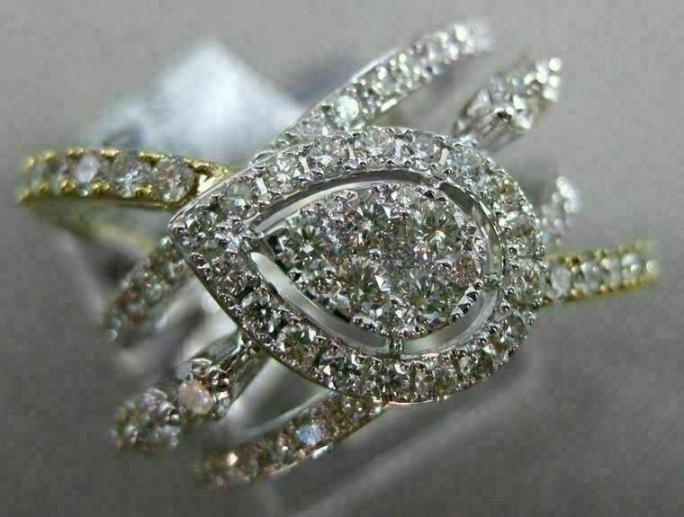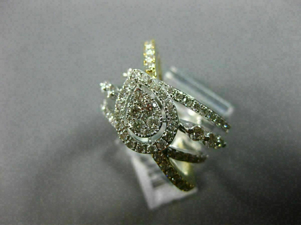 ESTATE LARGE 14KT WHITE AND YELLOW GOLD ANNIVERSARY RING. 3D MULTI ROW CLUSTER PEAR SHAPE HALO CRISS CROSS DESIGN. DIAMONDS ARE F/G COLOR, VSSI CLARITY 1.40 CARATS. MEASURES 16MM WIDE. RING SIZE 7.25. CAN BE SIZED BY OUR MASTER JEWELER UPON REQUEST. WRITTEN APPRAISAL AVAILABLE. COMES IN A PRESENTABLE GIFT BOX.