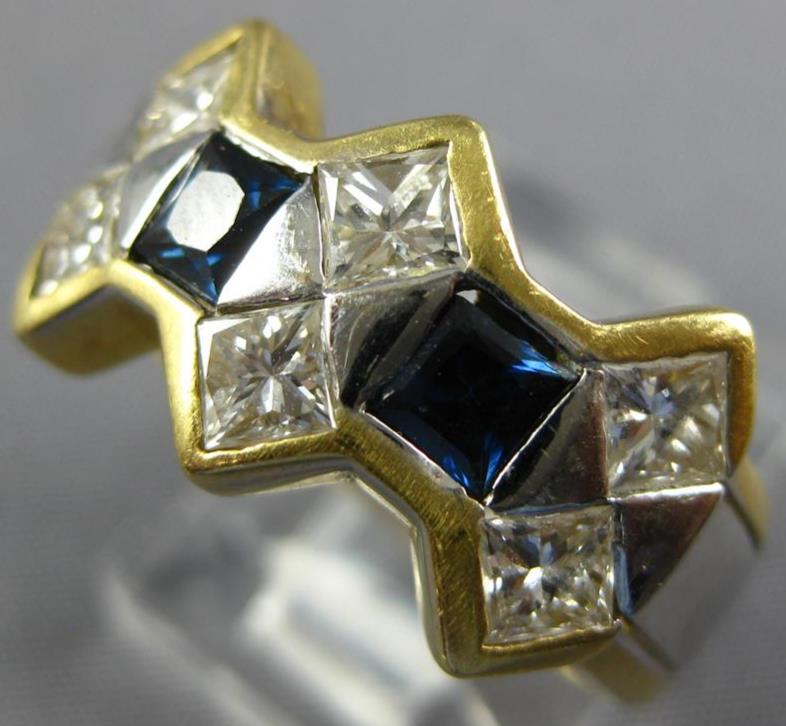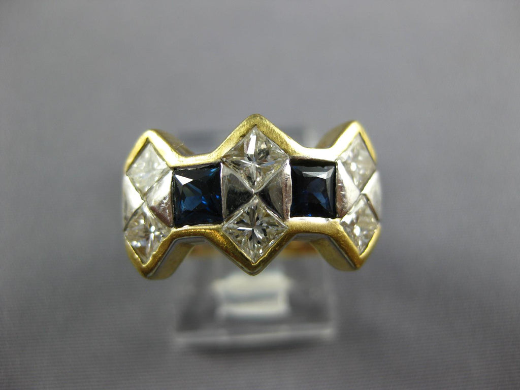 ESTATE LARGE 18KT WHITE AND YELLOWGOLD ANNIVERSARY RING. 3D CLASSIC DESIGN. PRINCESS CUTDIAMONDS ARE F/G COLOR, VVS-VS CLARITY 1.20 CARATS. AAA PRINCESS CUT SAPPHIRES ARE .50 CARATS.MEASURES 11mm WIDE. RING SIZE 7. CAN BE SIZED BY OUR MASTER JEWELER UPON REQUEST. WRITTEN APPRAISAL AVAILABLE. COMES IN A PRESENTABLE GIFT BOX.