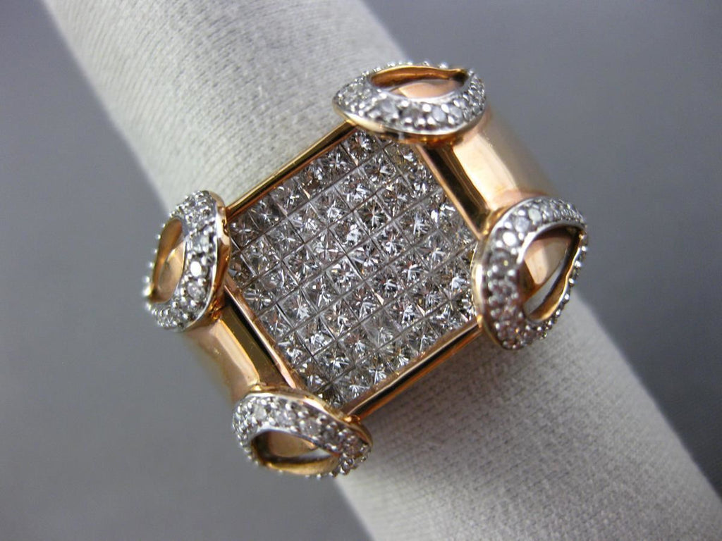 ESTATE LARGE 14KT ROSE GOLD RING. 3D INVISIBLE PEAR SHAPE DESIGN. ROUND & PRINCESS DIAMONDS ARE F/G COLOR, VSSI CLARITY. ROUND DIAMONDS ARE .63 CARATS. PRINCESS DIAMONDS ARE 1.30 CARATS. MEASURES 12mm WIDE. RING SIZE 9.75. CAN BE SIZED BY OUR MASTER JEWELER UPON REQUEST. WRITTEN APPRAISAL AVAILABLE. COMES IN A PRESENTABLE GIFT BOX