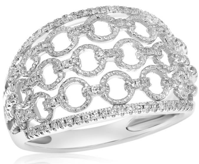 ESTATE WIDE14KT WHITEGOLD ANNIVERSARYRING. 3D MULTI ROW LOVE KNOTDESIGN.DIAMONDS ARE F/G COLOR, VSSI CLARITY .34CARATS.RING SIZE 7. CAN BE SIZED BY OUR MASTER JEWELER UPON REQUEST. WRITTEN APPRAISAL AVAILABLE. COMES IN A PRESENTABLE GIFT BOX.