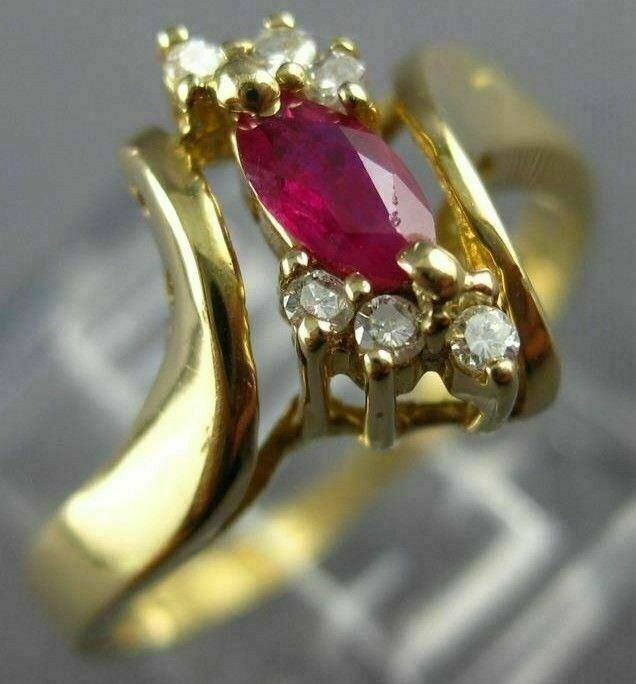 ESTATE WIDE 14KT YELLOW GOLD RING. 3D DESIGN. ROUND DIAMONDS ARE G COLOR, VSSI CLARITY .08 CARATS. AAA MARQUISE RUBY IS .35 CARATS. MEASURES 11mm WIDE. RING SIZE 6. CAN BE SIZED BY OUR MASTER JEWELER UPON REQUEST. WRITTEN APPRAISAL AVAILABLE. COMES IN A PRESENTABLE GIFT BOX.