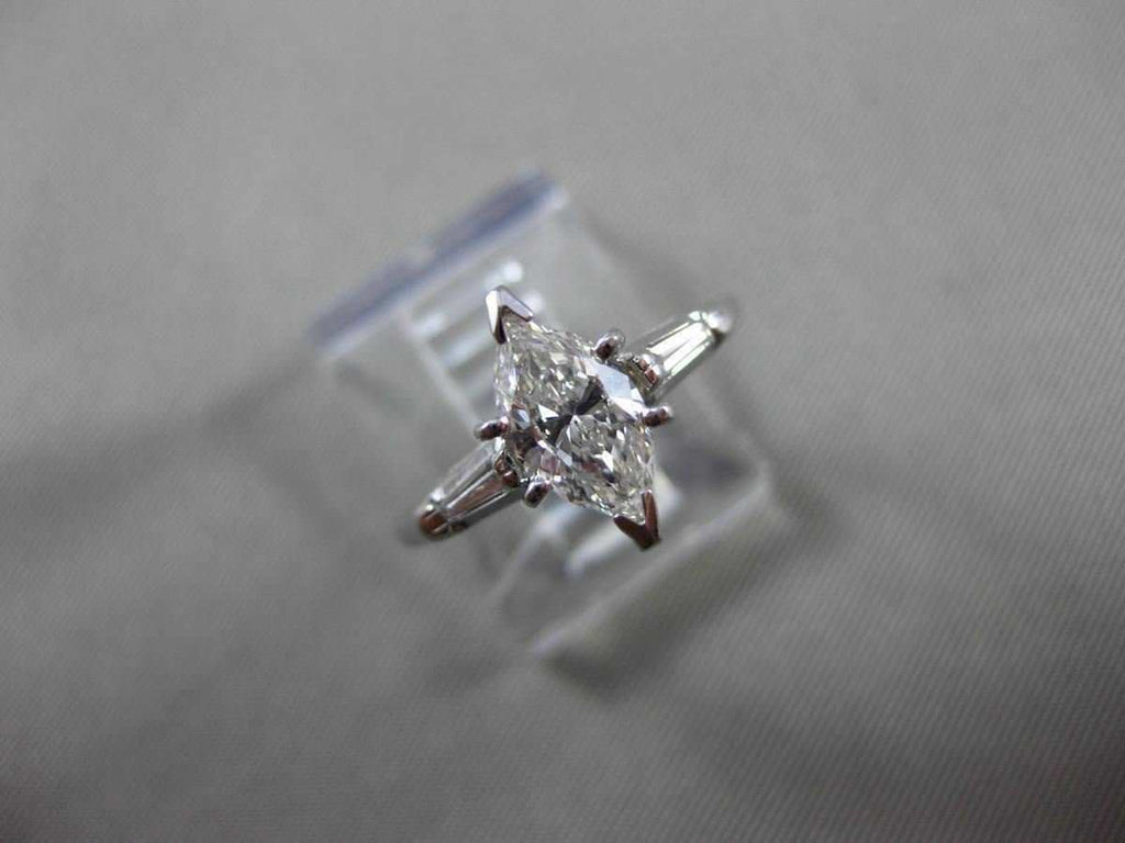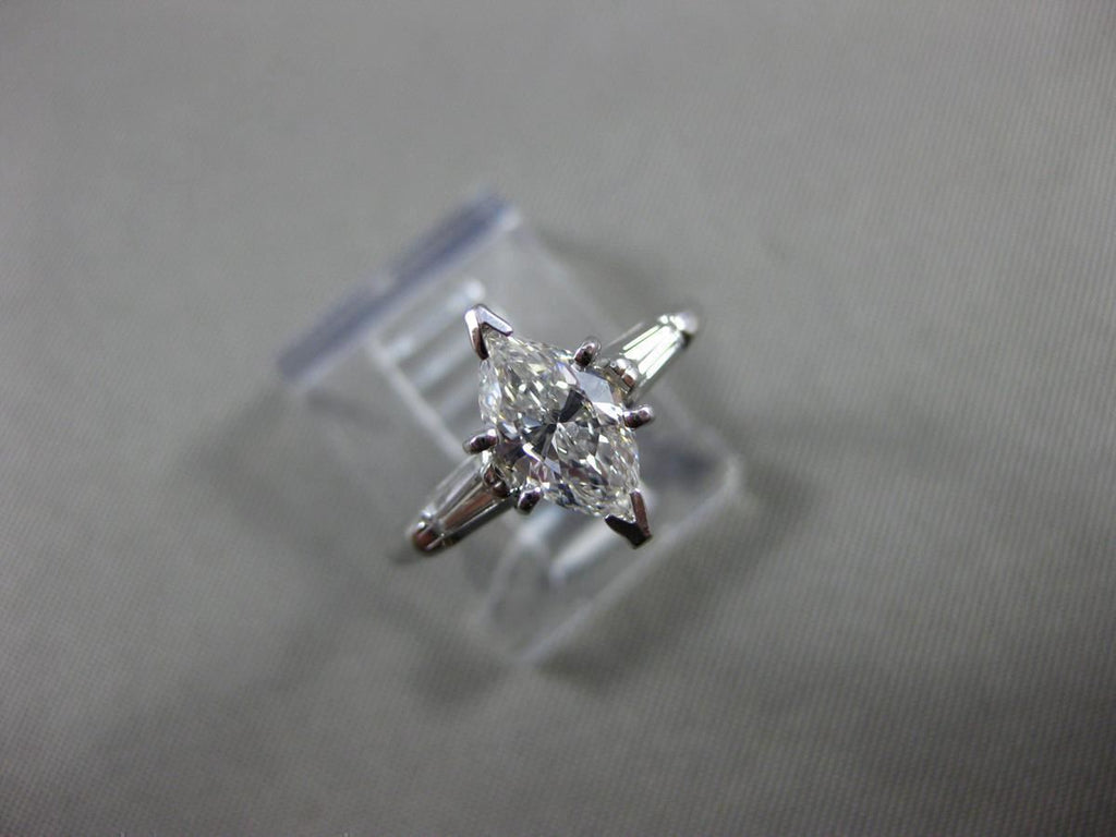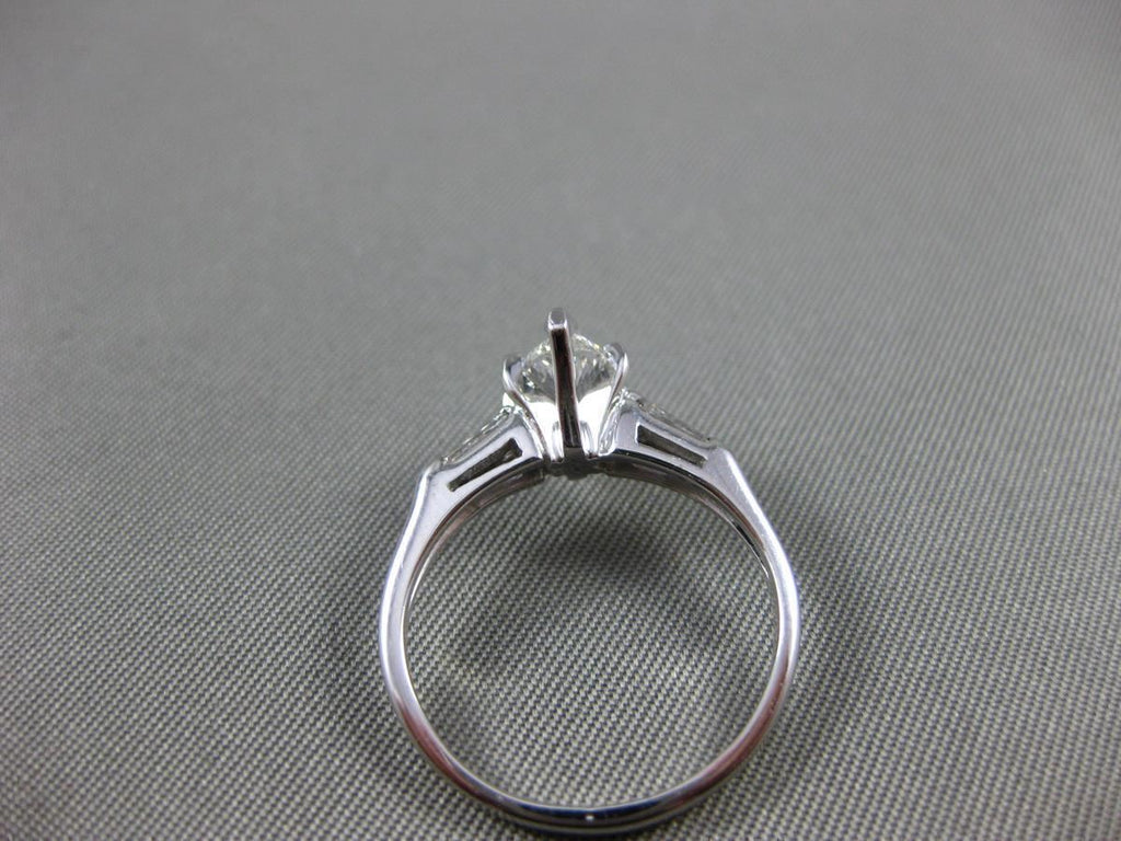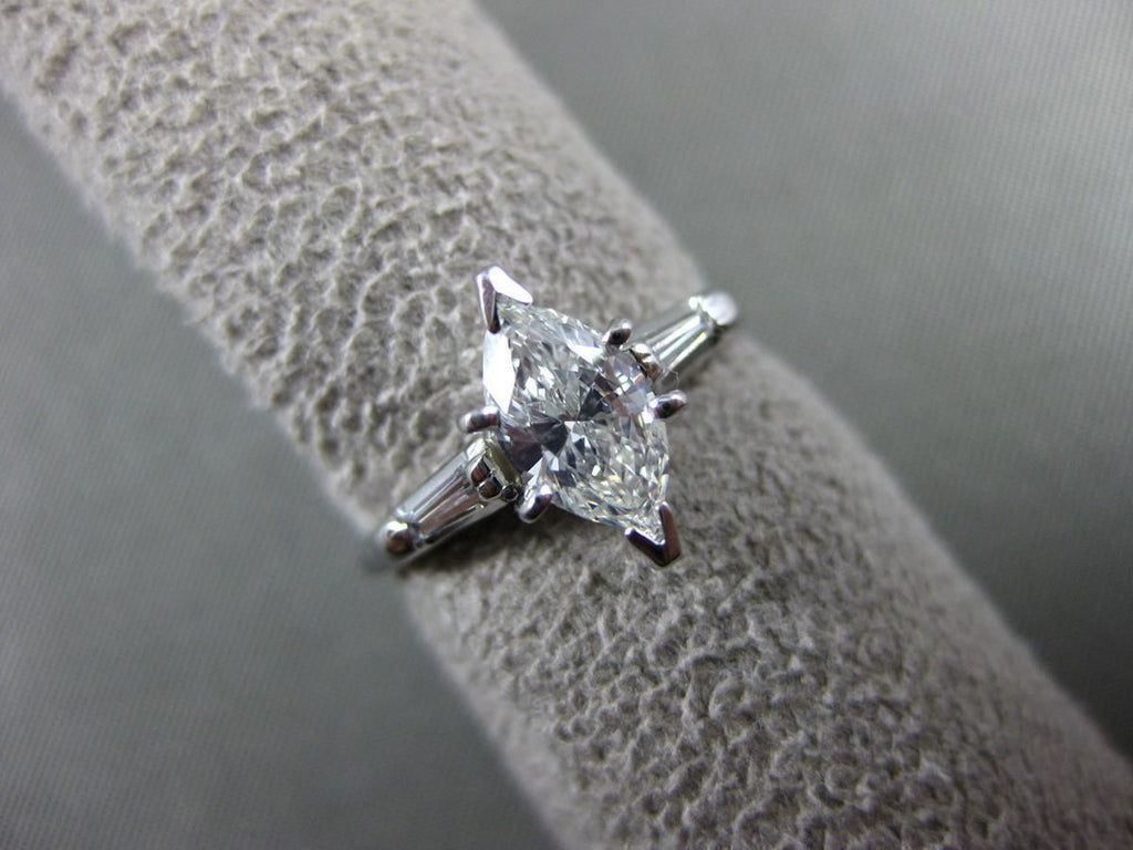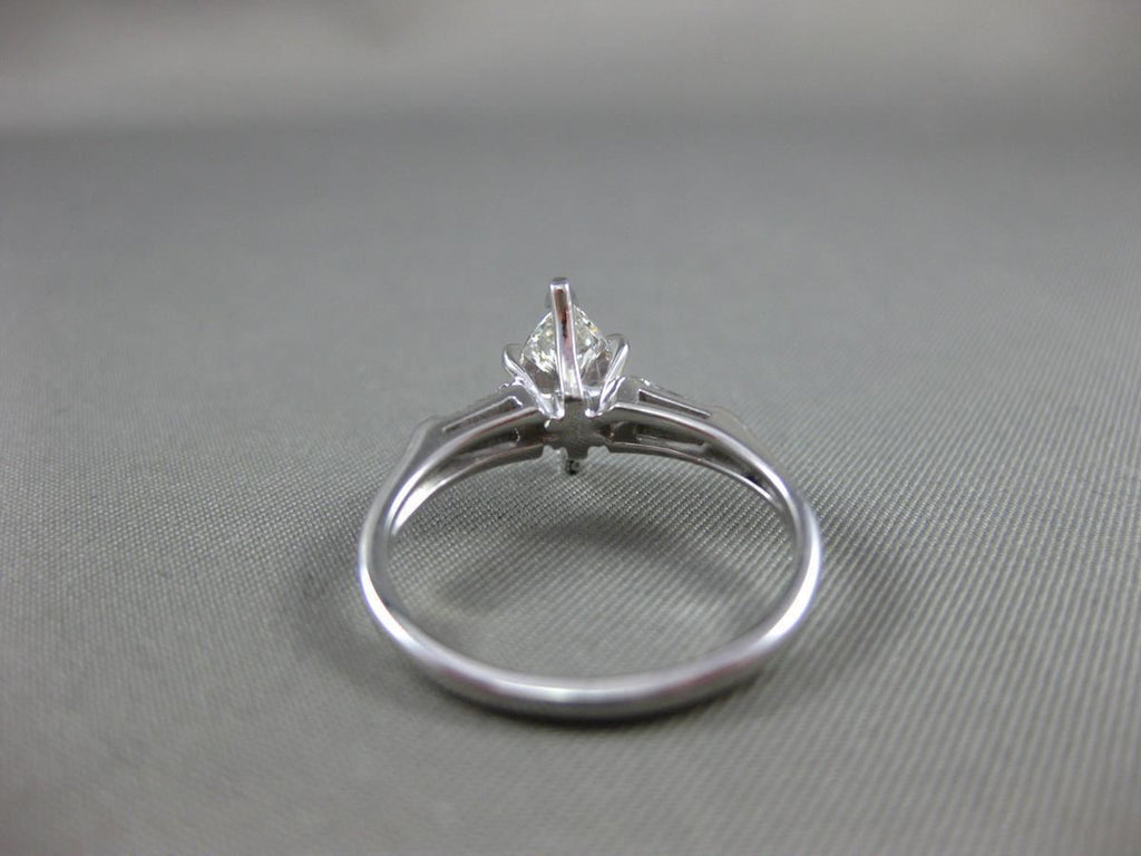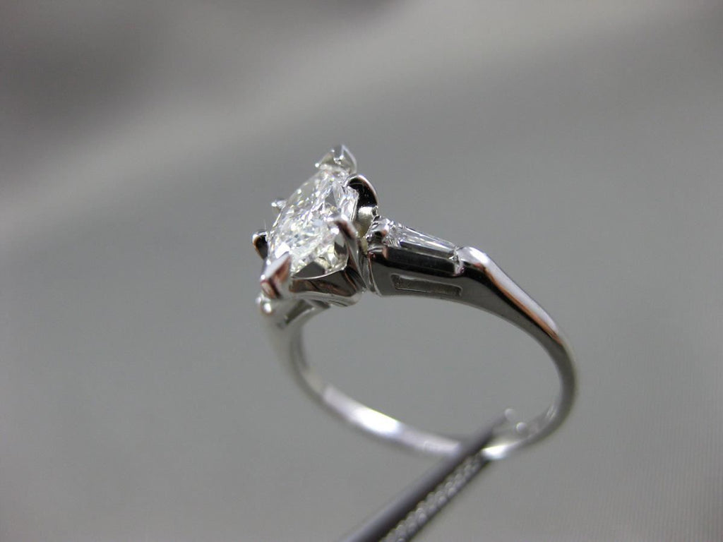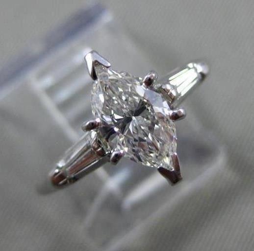 ESTATE 14KT WHITE GOLD ENGAGEMENT RING. 3 STONE PAST PRESENT FUTURE DESIGN. DIAMONDS ARE F/G COLOR AND VSSI CLARITY. MARQUISE DIAMOND IS .71 CARATS. BAGUETTE DIAMONDS ARE .15 CARATS. MEASURE 10mm WIDE. RING SIZE IS 5. CAN BE SIZED BY OUR MASTER JEWELER. WRITTEN APPRAISAL AVAILABLE. COMES IN A PRESENTABLE GIFT BOX.