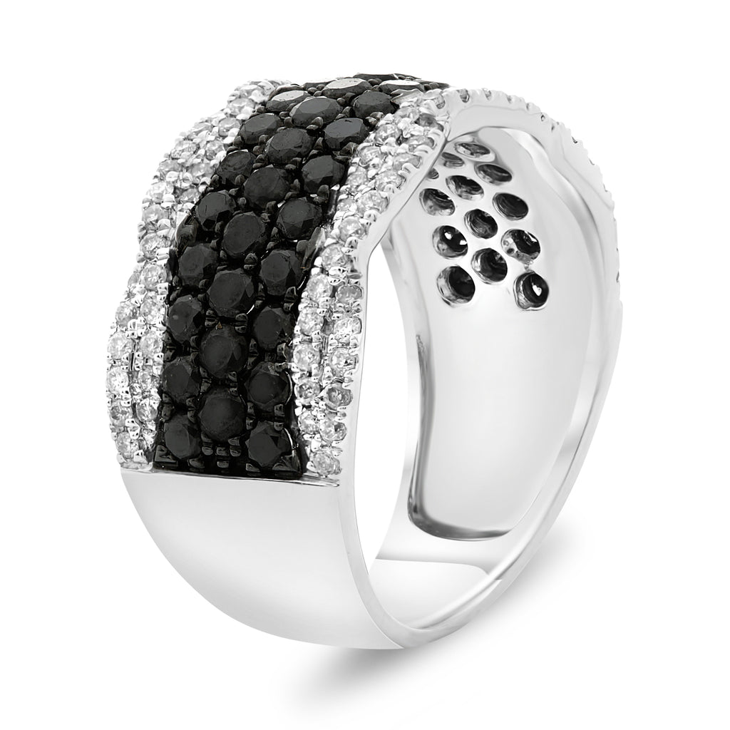 WIDE 18KT WHITE GOLD ANNIVERSARY RING. 3D MULTI ROW  DESIGN. ROUND WHITE DIAMONDS ARE F/G COLOR, VSSI CLARITY .41 CARATS. ROUND BLACK DIAMONDS ARE 1.38 CARATS.  MEASURES 9mm WIDE. RING SIZE 6.5. CAN BE SIZED BY OUR MASTER JEWELER UPON REQUEST. WRITTEN APPRAISAL AVAILABLE. COMES IN A PRESENTABLE GIFT BOX.