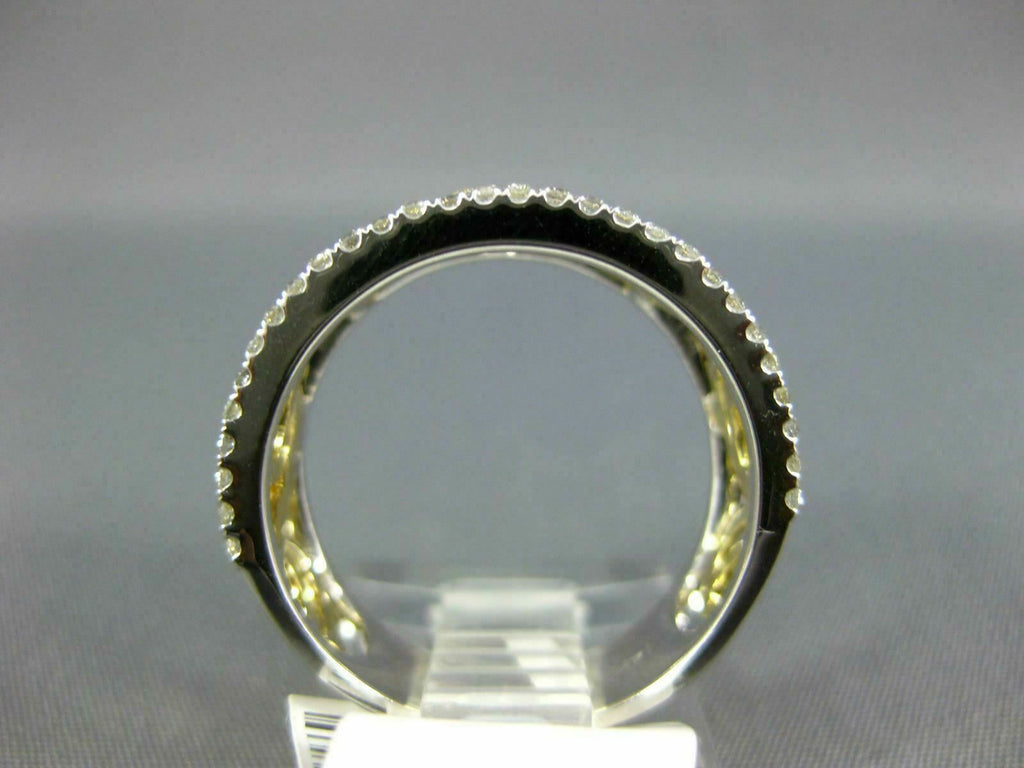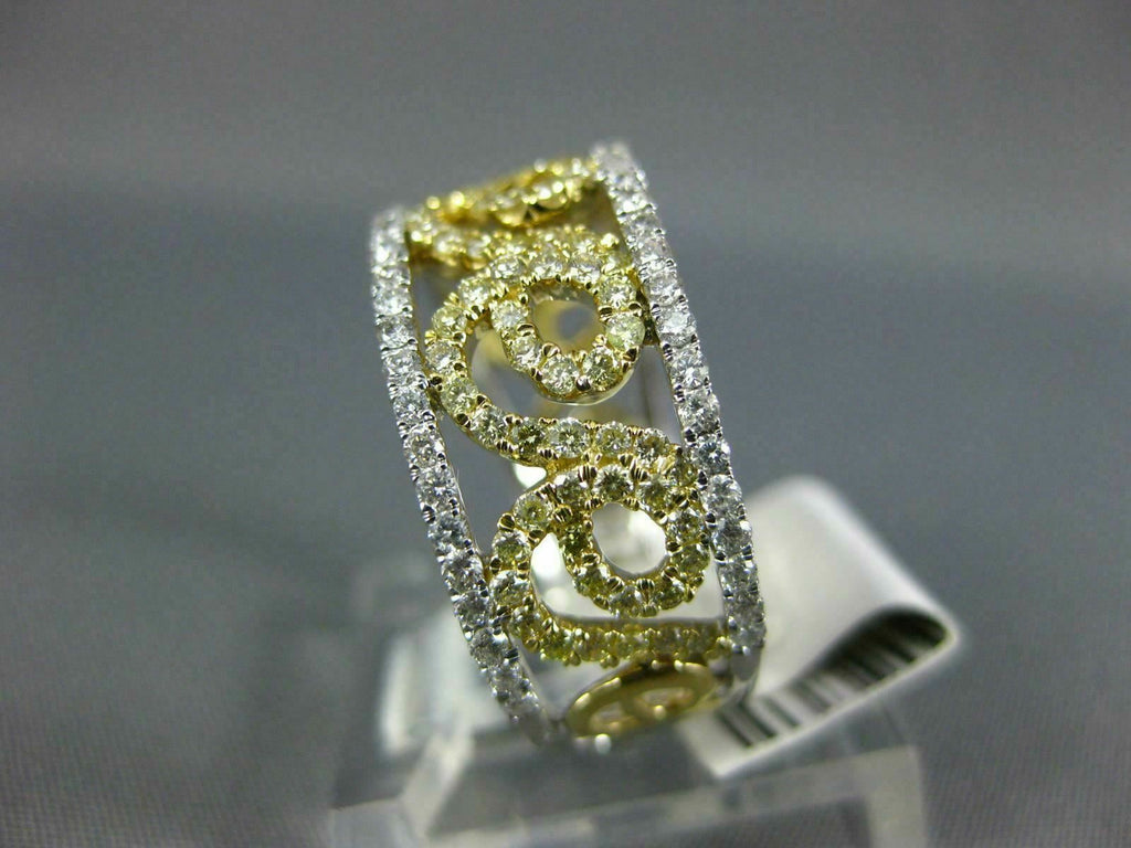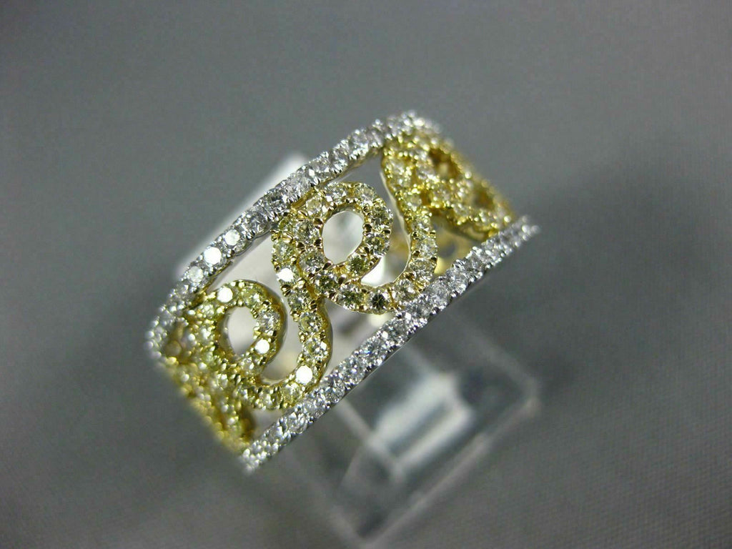 WIDE14KT WHITE GOLD WEDDING ANNIVERSARYRING. 3D OPEN FILIGREE SEMI ETERNITYDESIGN. WHITEDIAMONDS ARE F/G COLOR, VSSI CLARITY.44 CARATS. FANCY YELLOW DIAMONDS ARE .48 CARATS.MEASURES 9mm WIDE.RING SIZE 7. CAN BE SIZED BY OUR MASTER JEWELER UPON REQUEST. WRITTEN APPRAISAL AVAILABLE. COMES IN A PRESENTABLE GIFT BOX.