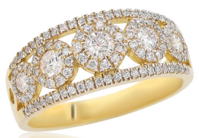 WIDE 14KT YELLOWGOLD ANNIVERSARY RING. 3D MULTI FLOWER CLASSICDESIGN. DIAMONDS ARE F/G COLOR, VSSI CLARITY .96CARATS.RING SIZE 7. CAN BE SIZED BY OUR MASTER JEWELER UPON REQUEST. WRITTEN APPRAISAL AVAILABLE. COMES IN A PRESENTABLE GIFT BOX.