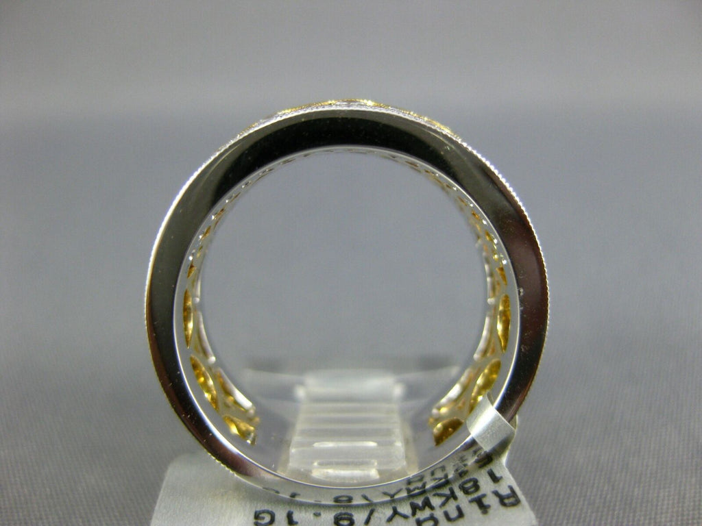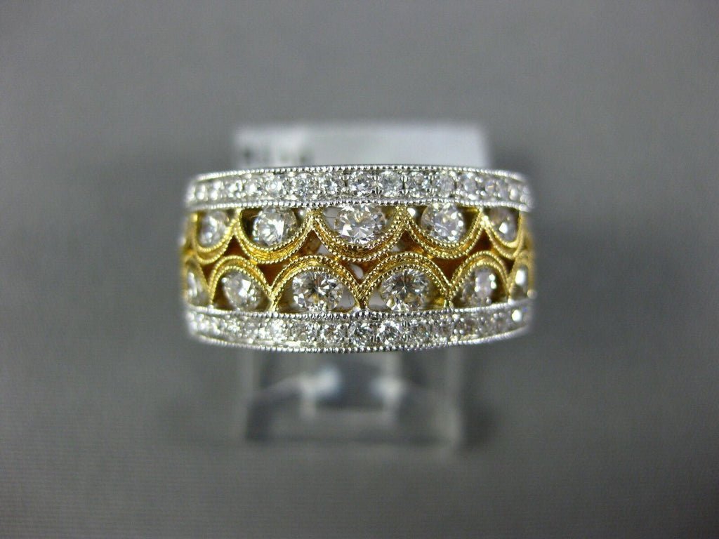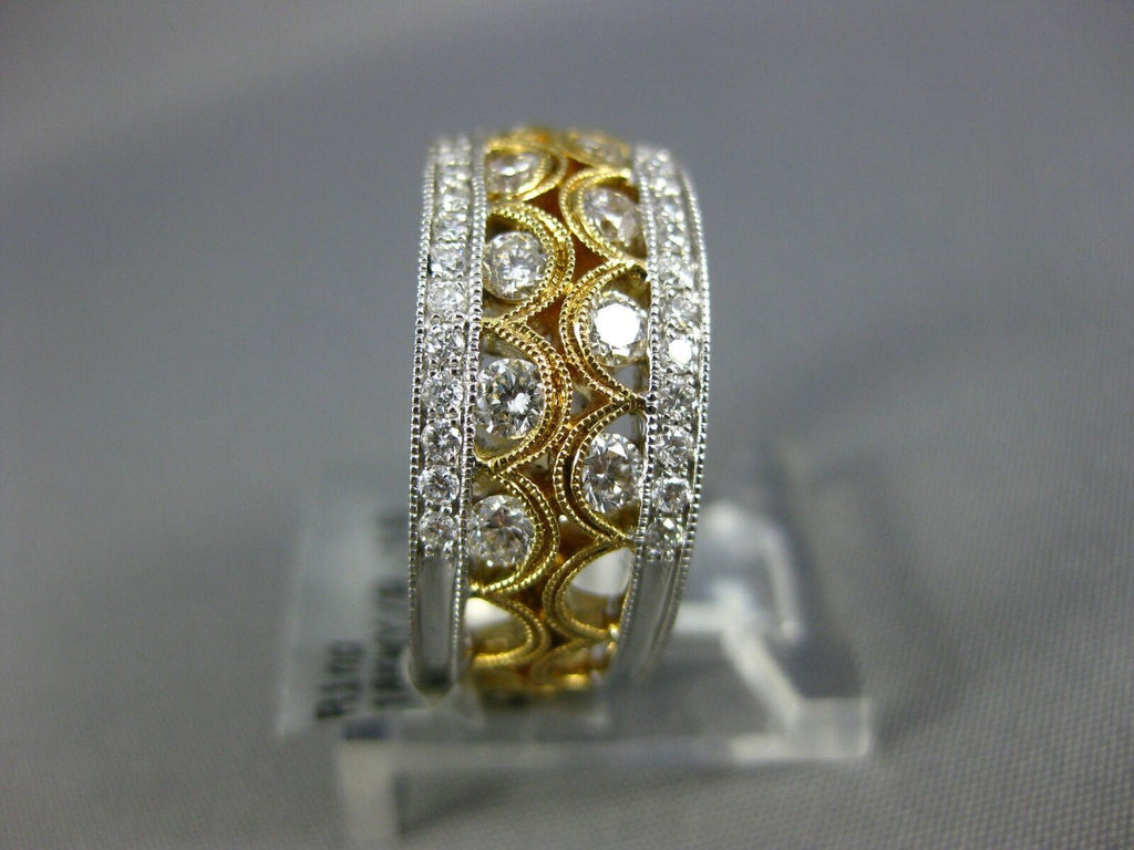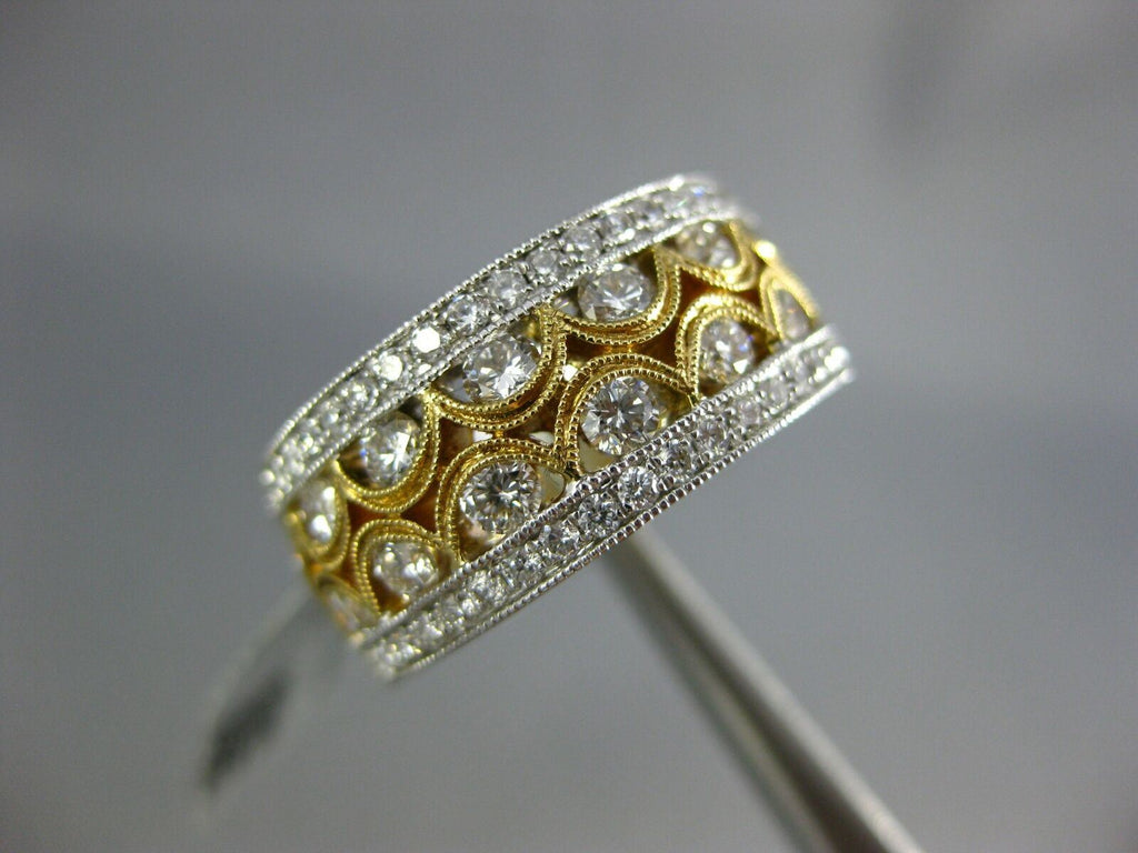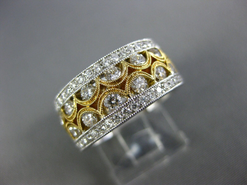 WIDE18KT WHITE & YELLOWGOLD WEDDING ANNIVERSARYRING. 3D MULTI ROW OPEN FILIGREEDESIGN.DIAMONDS ARE F/G COLOR, VSSI CLARITY .97 CARATS. MEASURES 9mm WIDE. RING SIZE 7. CAN BE SIZED BY OUR MASTER JEWELER UPON REQUEST. WRITTEN APPRAISAL AVAILABLE. COMES IN A PRESENTABLE GIFT BOX.