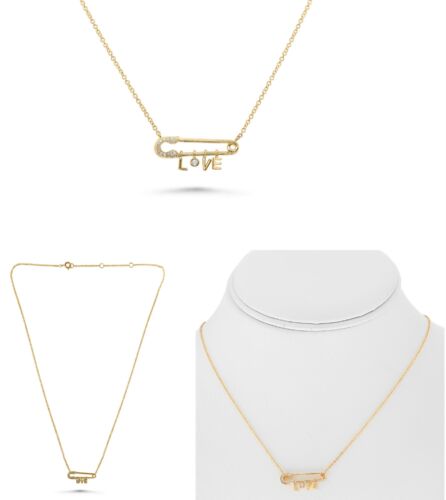 14KT YELLOW GOLD LOVE NECKLACE. 3D CLASSIC SAFETY PIN FLOATING ADJUSTABLE DESIGN. ROUND DIAMONDS ARE F/G COLOR, VS CLARITY .05 CARATS. 18" INCHES LONG.