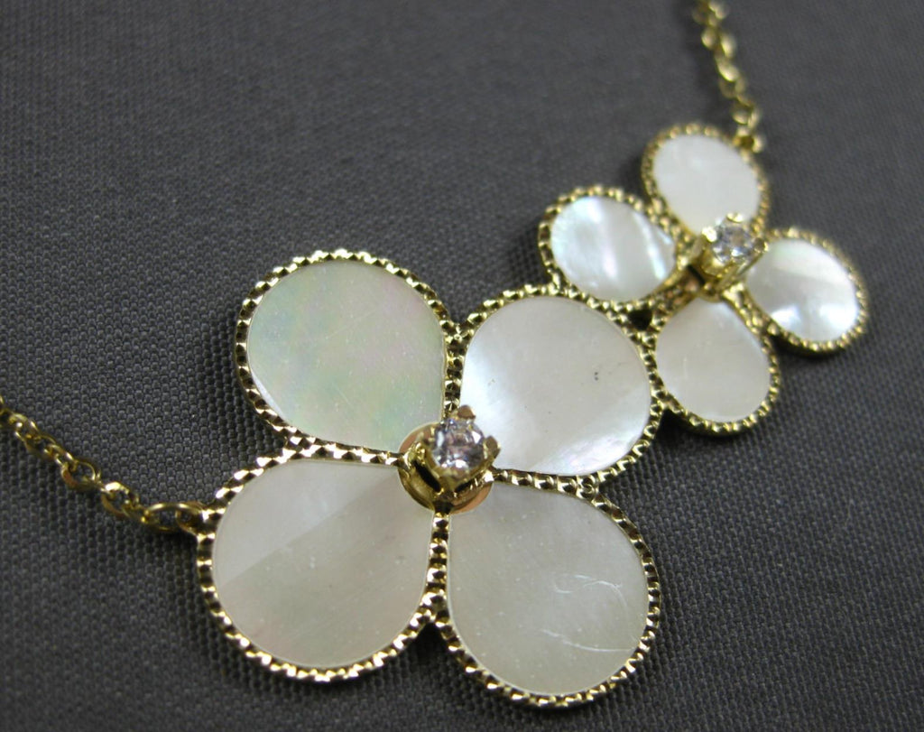 0.06CT DIAMOND & AAA MOTHER OF PEARL 14KT YELLOW GOLD DOUBLE FLOWER LOVE NECKLACE