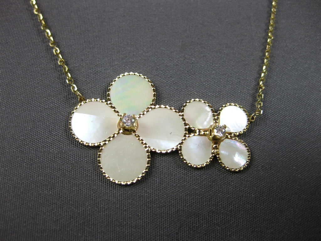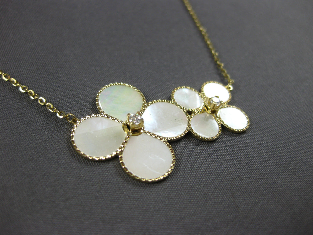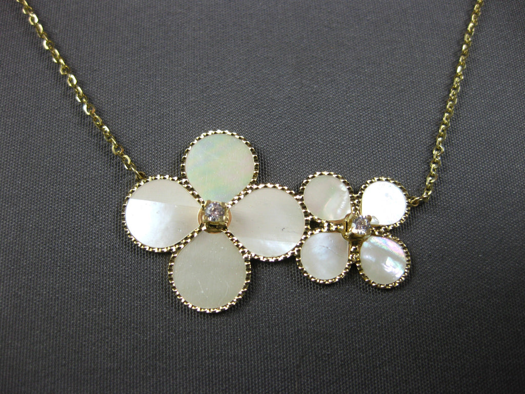 14KT YELLOW GOLD LOVE NECKLACE. 3D DOUBLE FLOWER DESIGN. ROUND DIAMONDS ARE F/G COLOR, VSSI CLARITY .06 CARATS. FEATURES AAA MOTHER OF PEARL. MEASURES 19mm X 31mm. 19" INCHES LONG. WRITTEN APPRAISAL AVAILABLE. COMES IN A PRESENTABLE GIFT BOX.