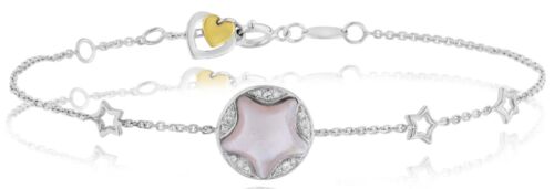 14KT WHITE AND YELLOW GOLD LOVE BRACELET. 3D STARFISH BY THE YARD ADJUSTABLE DESIGN. ROUND DIAMONDS ARE F/G COLOR, VSSI CLARITY .07 CARATS. FEATURES AAA MOTHER OF PEARL. 7" INCHES LONG.