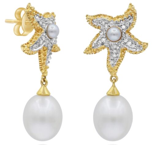 14KT YELLOW GOLD FUN HANGING EARRINGS. 3D STARFISH DESIGN. ROUND DIAMONDS ARE F/G COLOR, VSSI CLARITY .07 CARATS. FEATURES AAA SOUTH SEA PEARLS. WRITTEN APPRAISAL AVAILABLE. COMES IN A PRESENTABLE GIFT BOX.