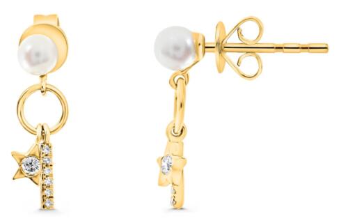 14KT YELLOW GOLD FUN HANGING EARRINGS. 3D SOLITAIRE STAR DOUBLE CHARM DESIGN. ROUND DIAMONDS ARE F/G COLOR, VS CLARITY .08 CARATS. FEATURES AAA SOUTH SEA PEARLS.
