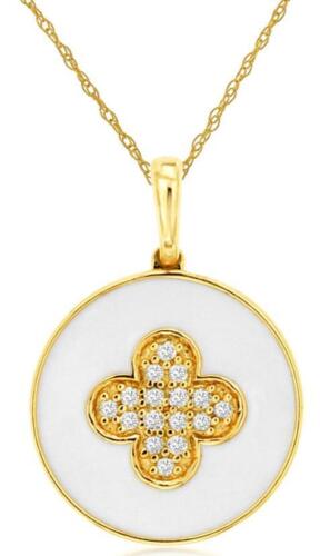 14KT YELLOW GOLD FLOATING PENDANT. 3D FOUR LEAF CLOVER FLOWER CIRCULAR DESIGN. DIAMONDS ARE F/G COLOR, VSSI CLARITY .08 CARATS. FEATURES AAA WHITE QUARTZ. COMES ON A 14KT GOLD DIAMOND CUT 16" INCH CHAIN. WRITTEN APPRAISAL AVAILABLE. COMES IN A PRESENTABLE GIFT BOX.