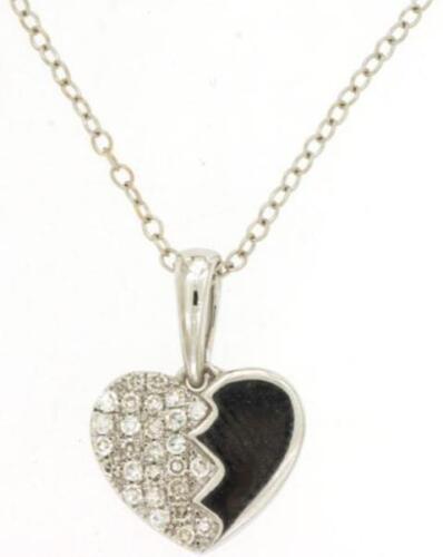 14KT WHITE GOLD LOVE FLOATING PENDANT. 3D BROKEN HEART DESIGN. ROUND DIAMONDS ARE F/G COLOR, VSSI CLARITY .12 CARATS. FEATURES AAA ROUND ONYX. COMES ON A 14KT GOLD DIAMOND CUT 16" INCH CHAIN.