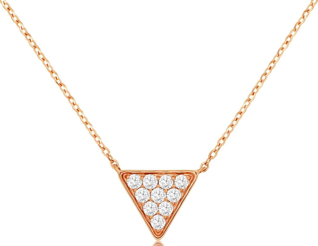 14KT ROSE GOLD LOVE NECKLACE. 3D CLASSIC CLUSTER TRIANGULAR TRILLION DESIGN. ROUND DIAMONDS ARE F/G COLOR, VSSI CLARITY .20 CARATS. 17" INCHES LONG. WRITTEN APPRAISAL AVAILABLE. COMES IN A PRESENTABLE GIFT BOX.