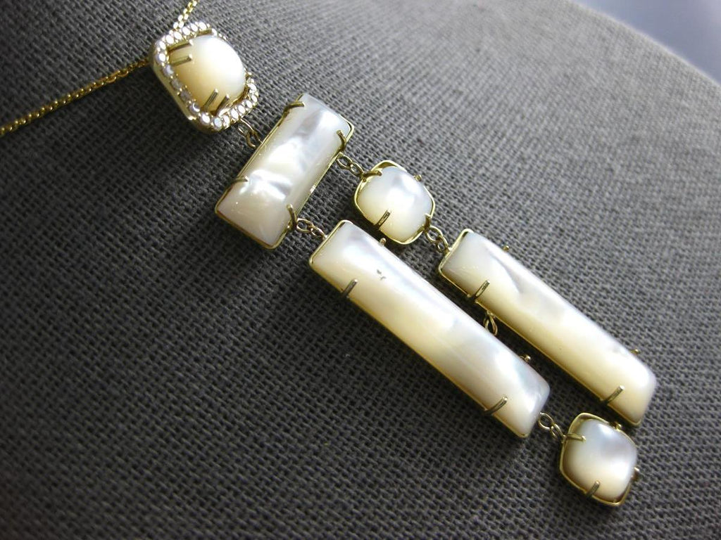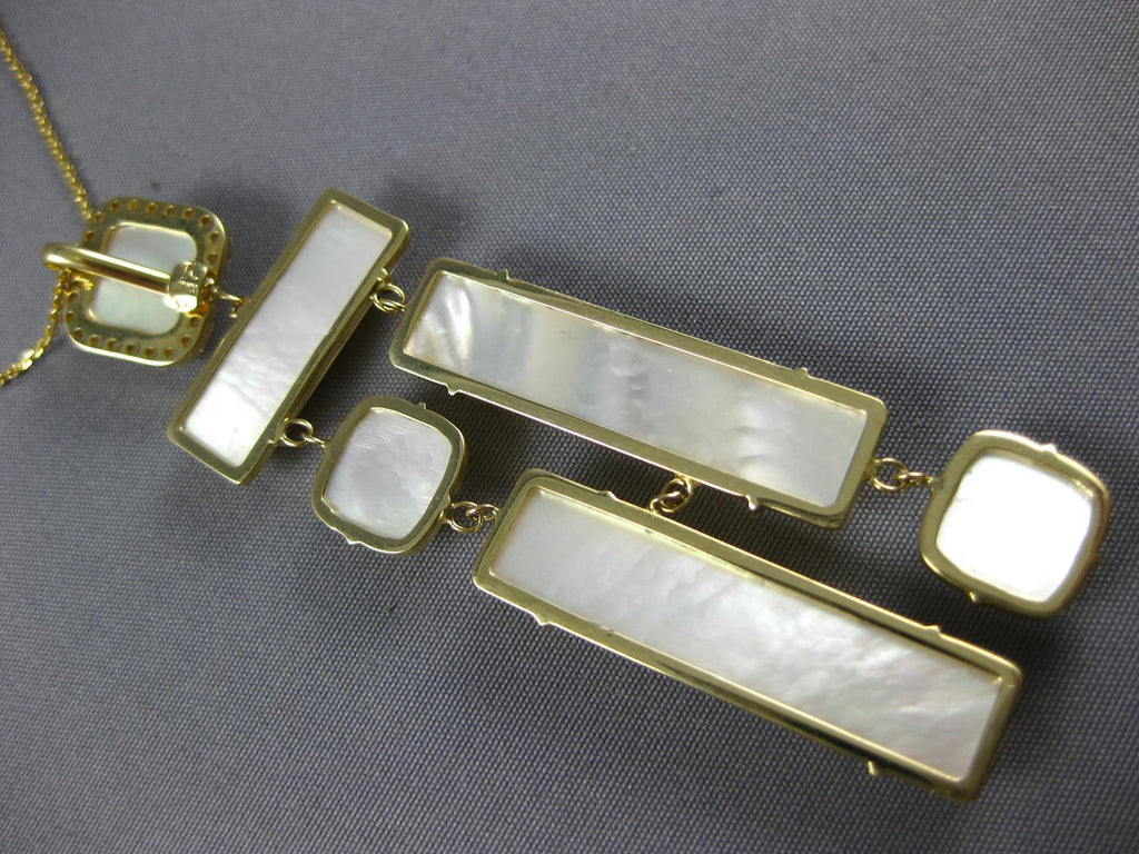 14KTYELLOWGOLD FLOATING FUNPENDANT. 3D MULTI SHAPE DESIGN. DIAMONDSARE F/G COLOR, VSSI CLARITY 0.35CARATS. FEATURES AAA MOTHER OF PEARL.MEASURES 66.0mm X 21.0mm.21.5" INCHES LONG. WRITTEN APPRAISAL AVAILABLE. COMES IN A PRESENTABLE GIFT BOX.