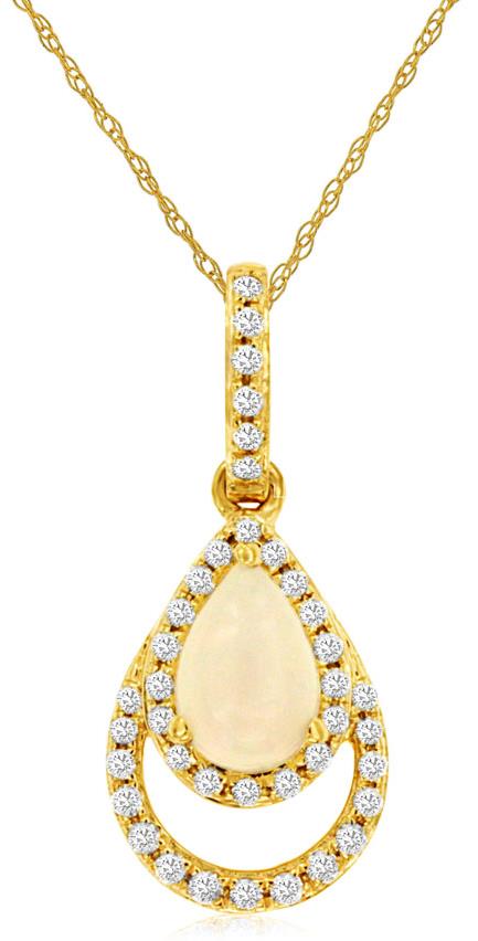 14KT YELLOW GOLD FLOATING PENDANT. 3D DOUBLE TEAR DROP DESIGN. ROUND DIAMONDS ARE F/G COLOR, VSSI CLARITY .11 CARATS. AAA PEAR SHAPE OPAL IS .25 CARATS. COMES ON A 14KT GOLD DIAMOND CUT 16" INCH CHAIN. WRITTEN APPRAISAL AVAILABLE. COMES IN A PRESENTABLE GIFT BOX.