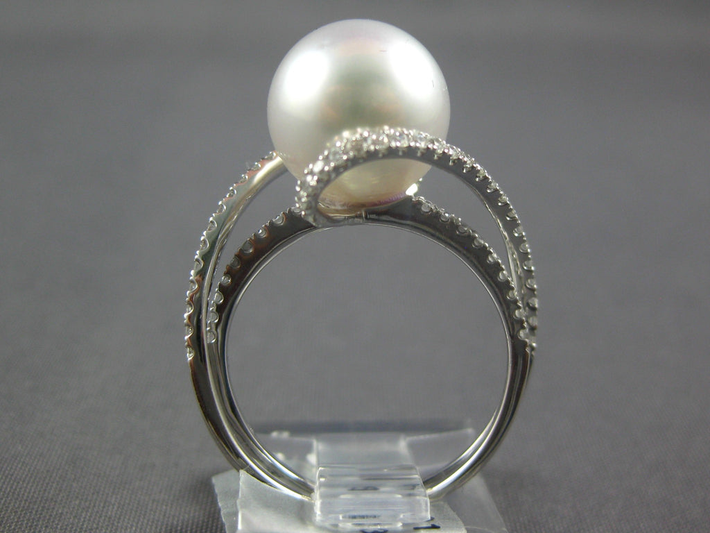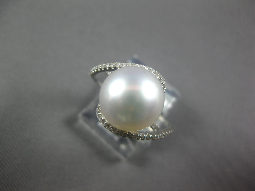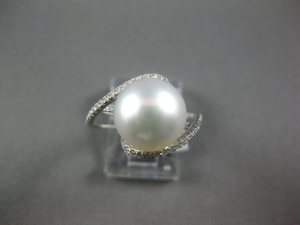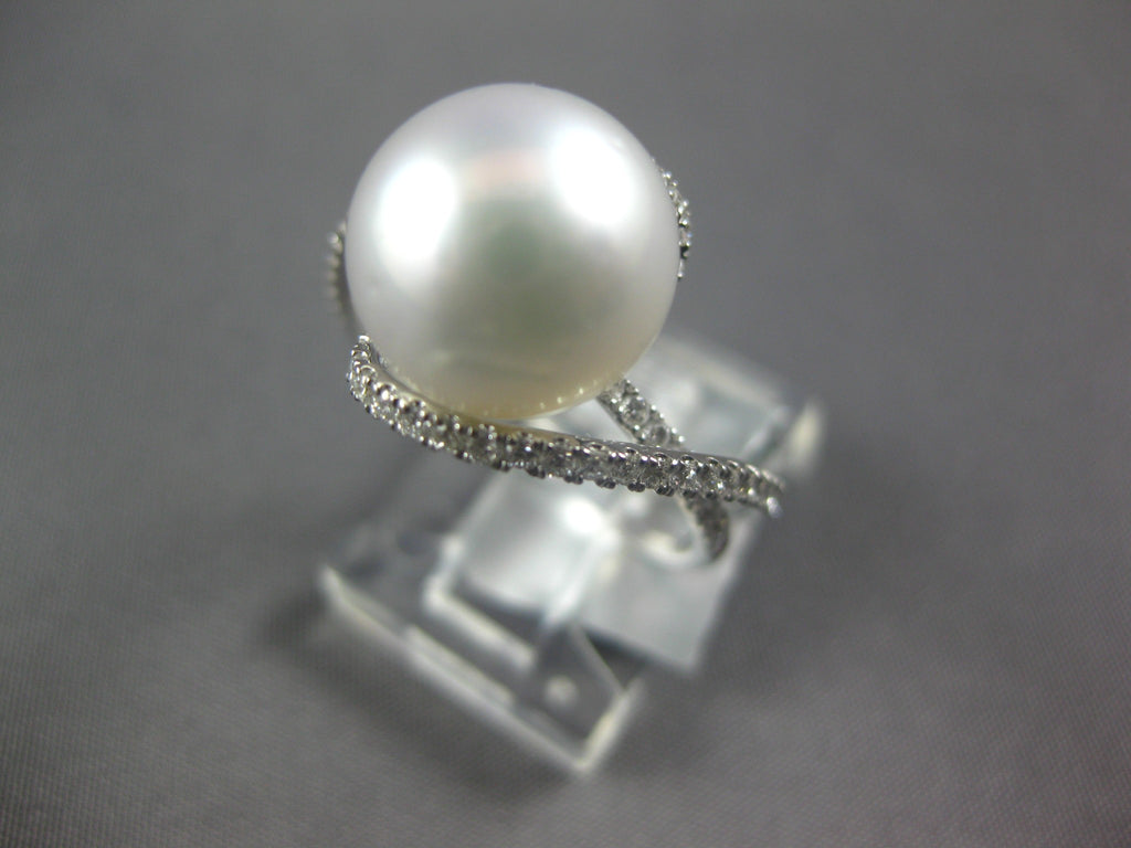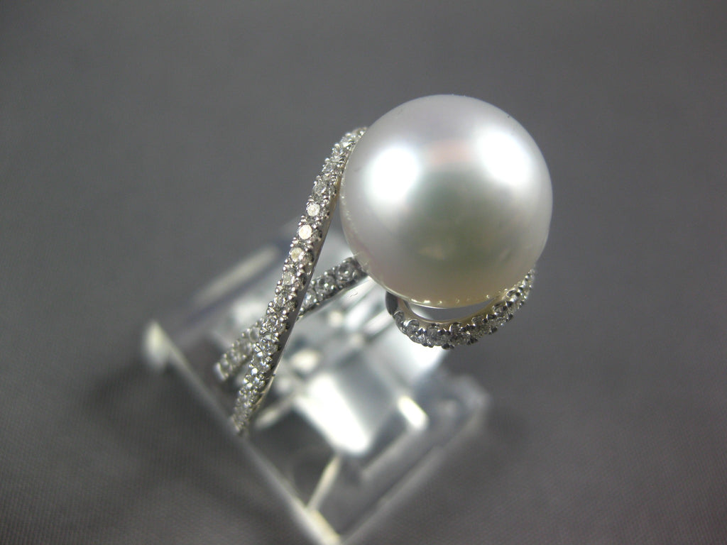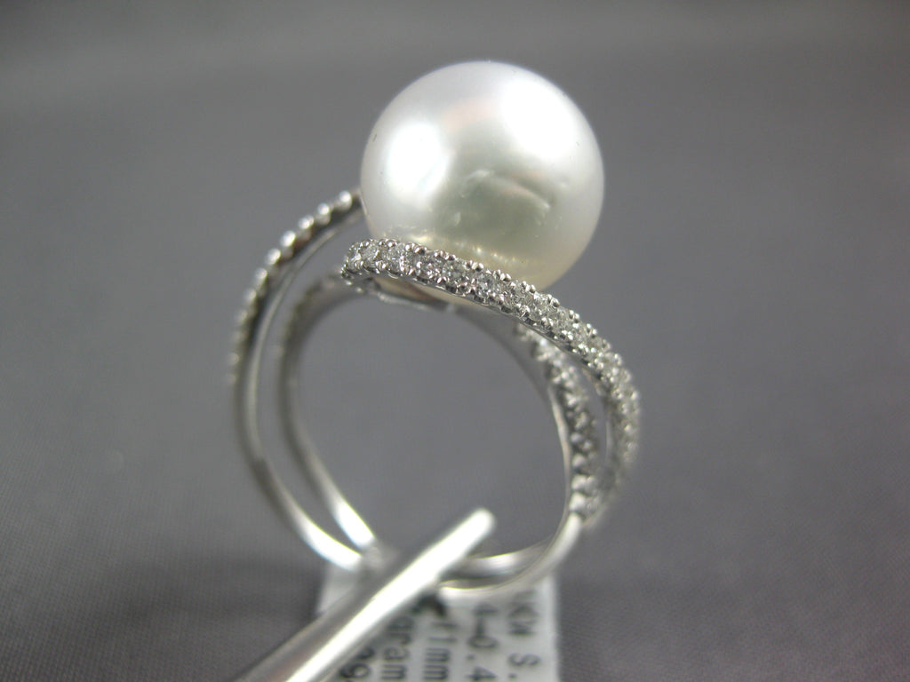14KT WHITE GOLD FUN RING. 3D CRISS CROSS LOVE KNOT DESIGN. DIAMONDS ARE F/G COLOR, VSSI CLARITY .42 CARATS. FEATURES 10.5MM WIDE SOUTH SEA PEARL. RING MEASURES 13mm WIDE. RING SIZE 6. CAN BE SIZED BY OUR MASTER JEWELER UPON REQUEST. WRITTEN APPRAISAL AVAILABLE. COMES IN A PRESENTABLE GIFT BOX.