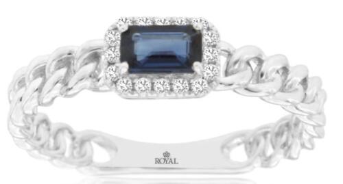 14KT WHITE GOLD ENGAGMENT RING. 3D HALO LINK DESIGN. ROUND DIAMONDS ARE F/G COLOR, VSSI CLARITY .07 CARATS. AAA EMERALD CUT SAPPHIRE IS .37 CARATS. RING SIZE 7. CAN BE SIZED BY OUR MASTER JEWELER UPON REQUEST. WRITTEN APPRAISAL AVAILABLE. COMES IN A PRESENTABLE GIFT BOX.